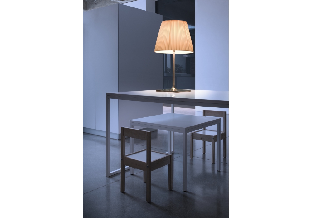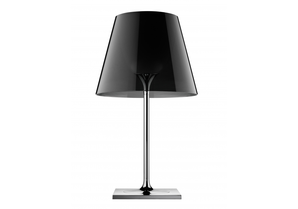 Ktribe T2 conçue par Philippe Starck pour Flos est une lampe de table à lumière diffuse. Base, tige et support diffuseur en alliage de zamak moulé sous pression poli. Tige en tube d'aluminium poli. Cache de base en nylon injecté noir mat. Diffuseur interne en polycarbonate injecté couleur opale. Diffuseur externe en PMMA. Variateur d'intensité intégré. Ampoule non incluse.