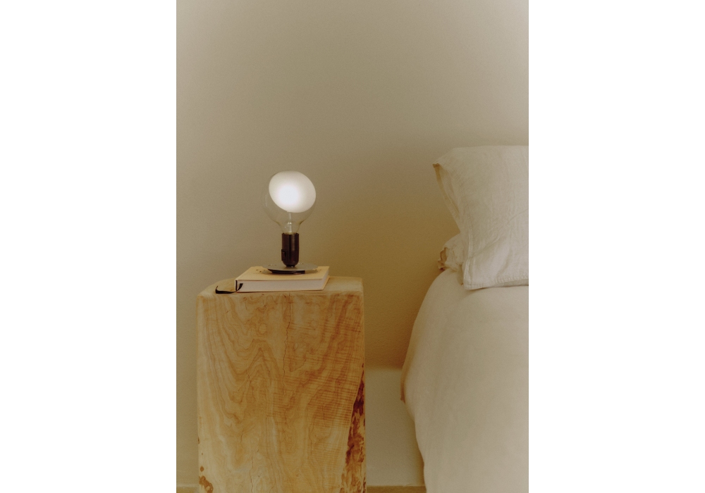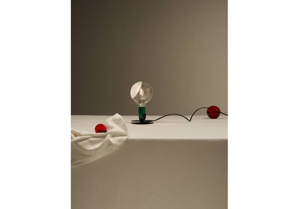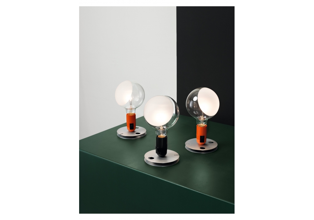 Lampadina conçue par Achille Castiglioni pour Flos est une lampe de table à lumière directe/diffuse. Base en aluminium anodisé, permettant également d'enrouler le câble électrique. Douille en bakélite, peinte à l'eau pour la version orange. Ampoule Globolux en verre transparent avec sablage partiel sur une face de la sphère. Interrupteur intégré (non réglable). Source lumineuse incluse.