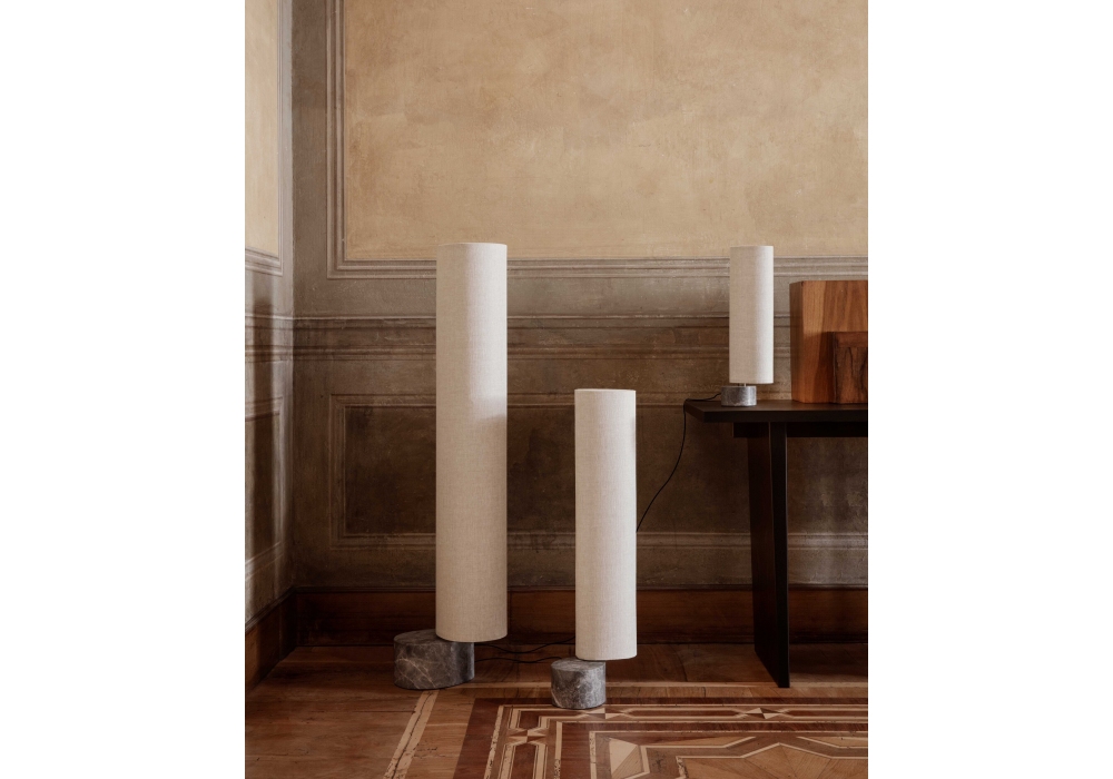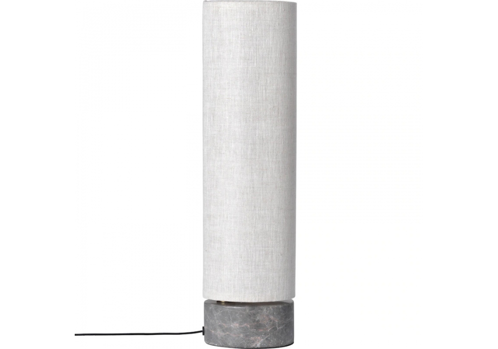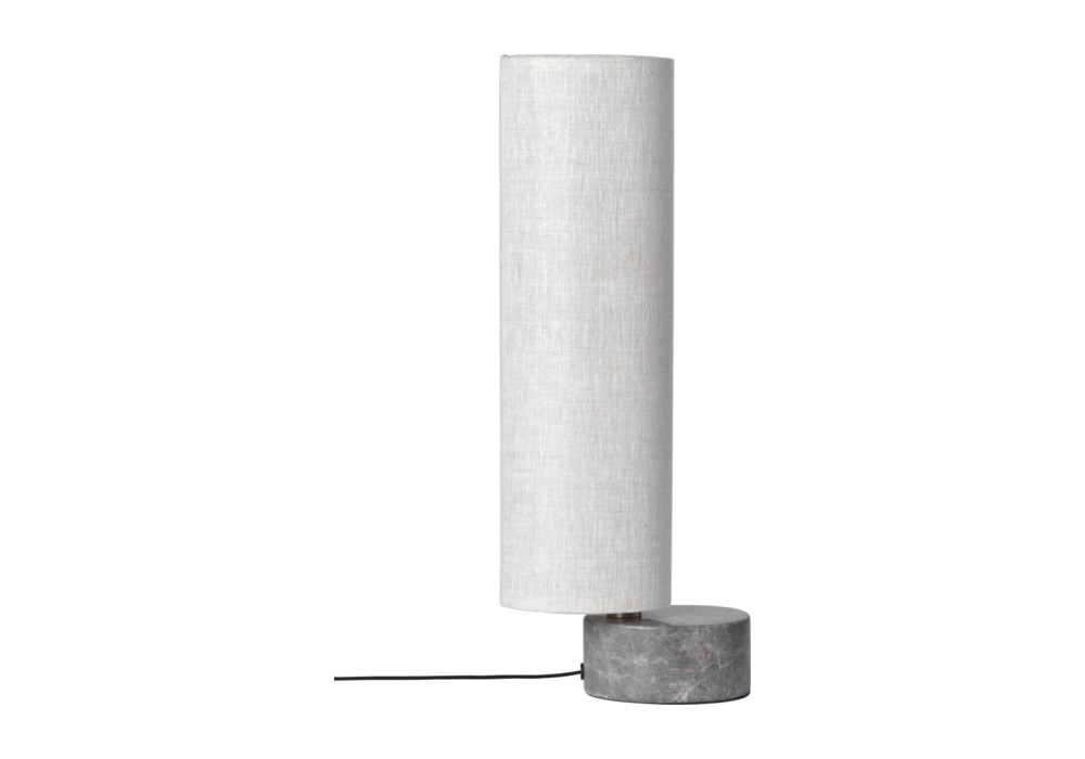Unbound conçue par Space Copenhagen pour Gubi est une lampe de table composée d'une base en marbre gris et d'un abat-jour en lin blanc ou en toile naturelle.