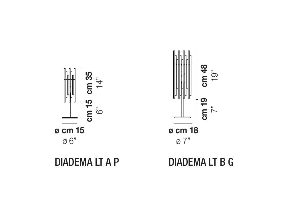 Diadema conçue par Romani Saccani Architetti Associati pour Vistosi est une lampe de table avec base circulaire et tige verticale en métal peint. Le diffuseur est structuré par une série d'éléments en cristal tubulaires placés côte à côte et protégeant une source lumineuse LED ou halogène avec connexion G9. Diadema est disponible en différents modèles et finitions.