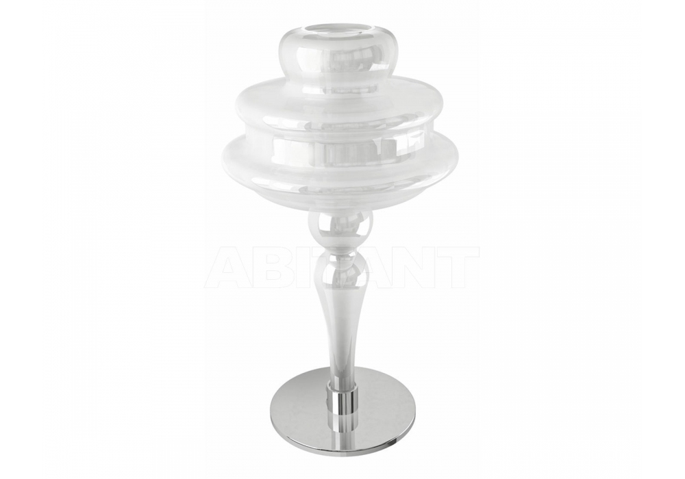 Novecento conçue par Romani Saccani Architetti Associati pour Vistosi est une lampe de table avec structure portante en métal et base circulaire en chrome poli. Le corps de la lampe et le diffuseur sont en verre et abritent une source lumineuse LED ou halogène avec culot E14. Novecento est disponible en différentes finitions.