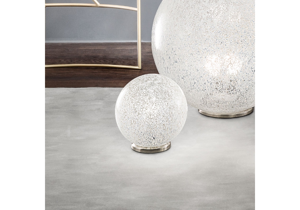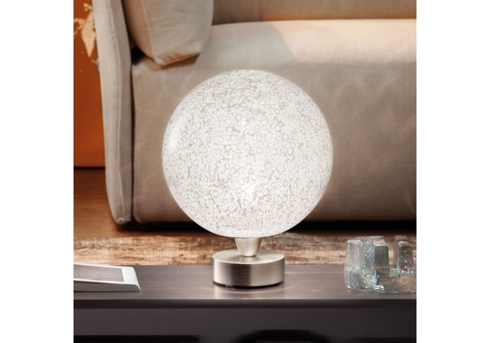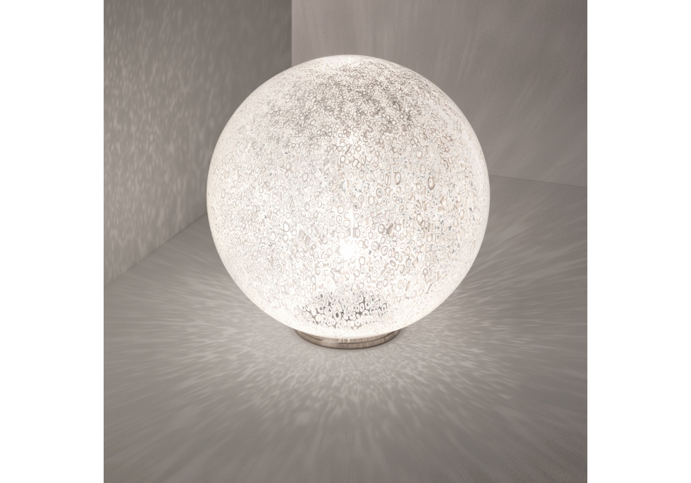 Rina conçue par Barbara Maggiolo pour Vistosi est une lampe de table avec base circulaire en métal couleur chrome poli. Le diffuseur est sphérique en verre murrina blanc à surface poreuse et adopte une source lumineuse de type LED ou halogène avec raccord G9 ou E27. Rina est disponible en différents modèles.