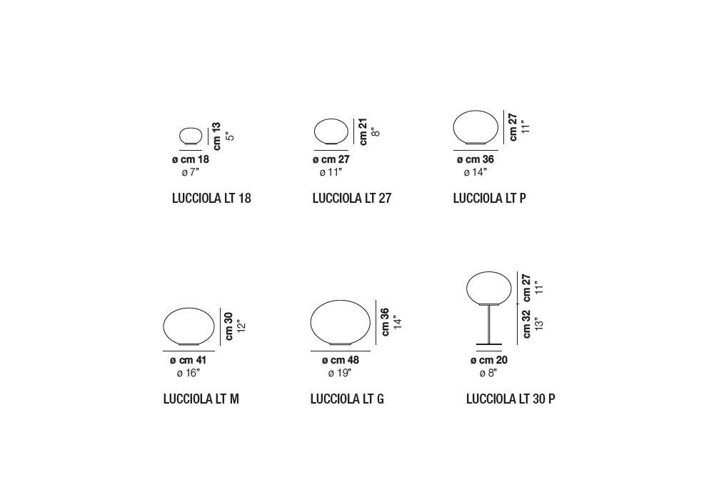 | Dimensions | Ø 18 x H 13 cm; Ø 27 x H 21 cm; Ø 36 x H 27 cm; Ø 41 x H 30 cm; Ø 48 x H 36 cm; Ø 20 x H 59 cm. |