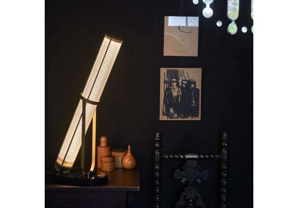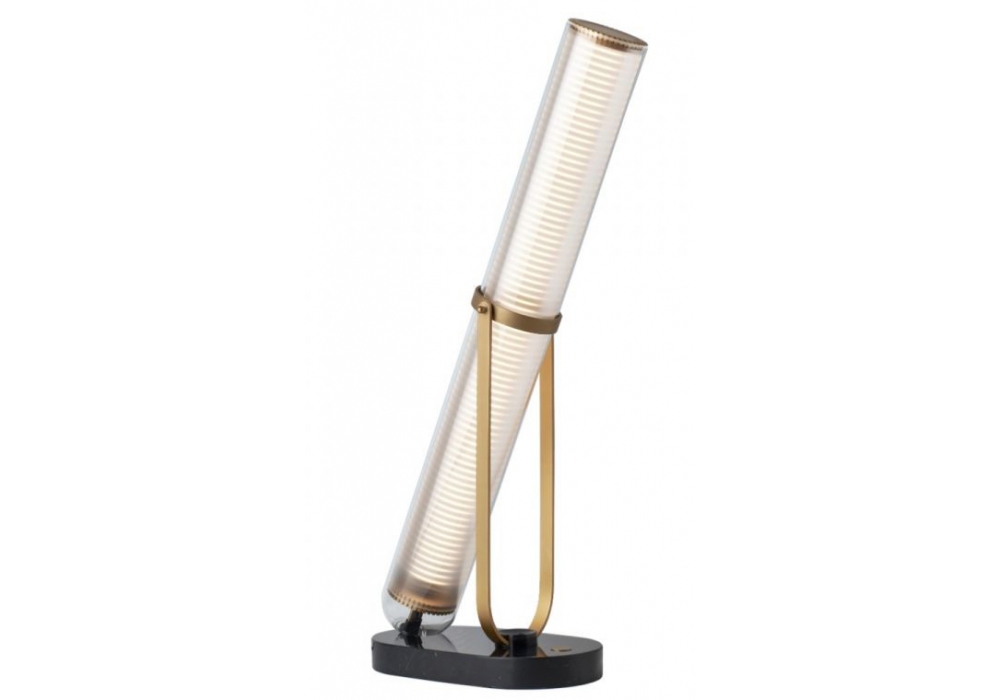 La Lampe Frechin conçue par Jean-Louis Frechin pour DCW Éditions est une lampe de table et de sol composée d'une base en marbre noir et aluminium anodisé, et d'un tube en borosilicate.