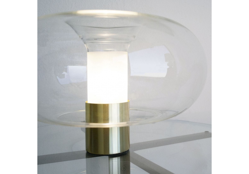 Fontanella conçue par Federico Peri pour Fontana Arte est une lampe de table avec structure portante et base cylindrique en métal galvanisé dans les finitions: chrome, noir ou laiton. Le diffuseur est ellipsoïdal en verre soufflé transparent. Disponible en différentes dimensions.