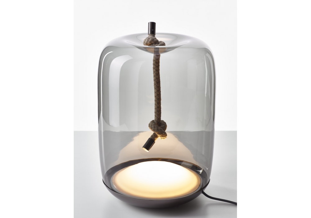 Knot conçu par Chiaramonte Marin pour Brokis est une lampe de table/lampadaire avec base circulaire en métal. Le diffuseur est cylindrique en verre soufflé avec une surface interne et externe à choisir entre brillante ou opaque. La source lumineuse est une LED dimmable avec un câble d'alimentation en fibre textile. Knot est disponible en différentes finitions de verre et de métal.