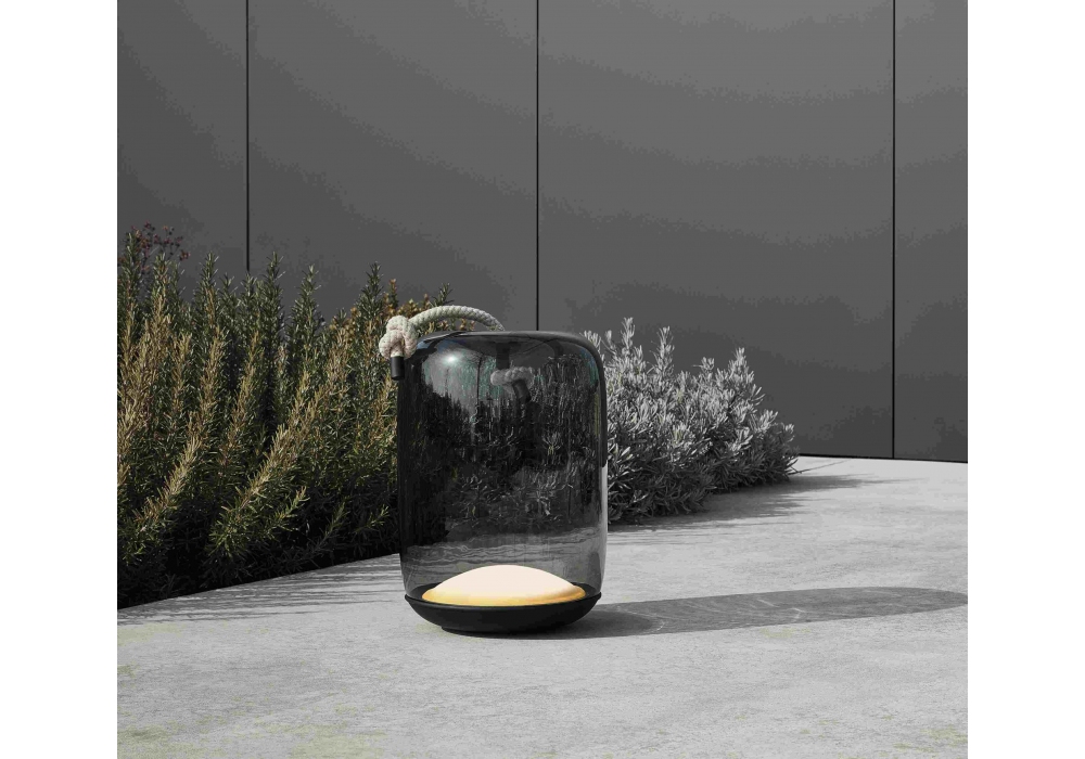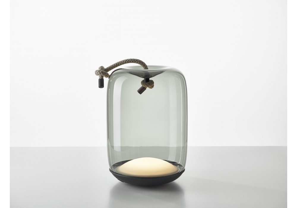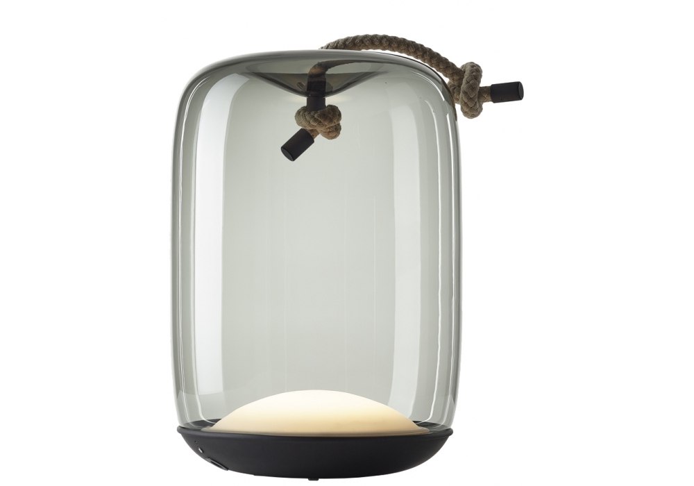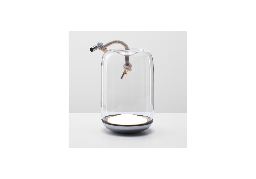 Knot Battery, conçue par Chiaramonte Marin pour Brokis, est une lampe de table portable dotée d'une base circulaire en métal, disponible en plusieurs finitions. Le diffuseur cylindrique en verre soufflé présente des surfaces intérieures et extérieures brillantes ou opaques. La source lumineuse est une LED avec variateur tactile. Câble d'alimentation USB noir.