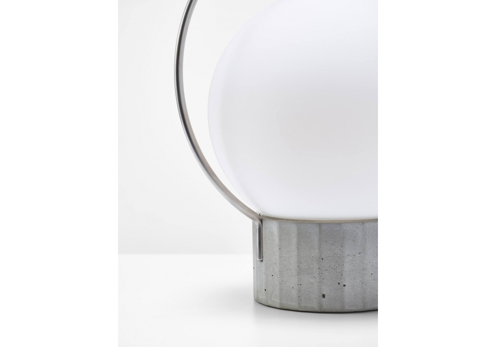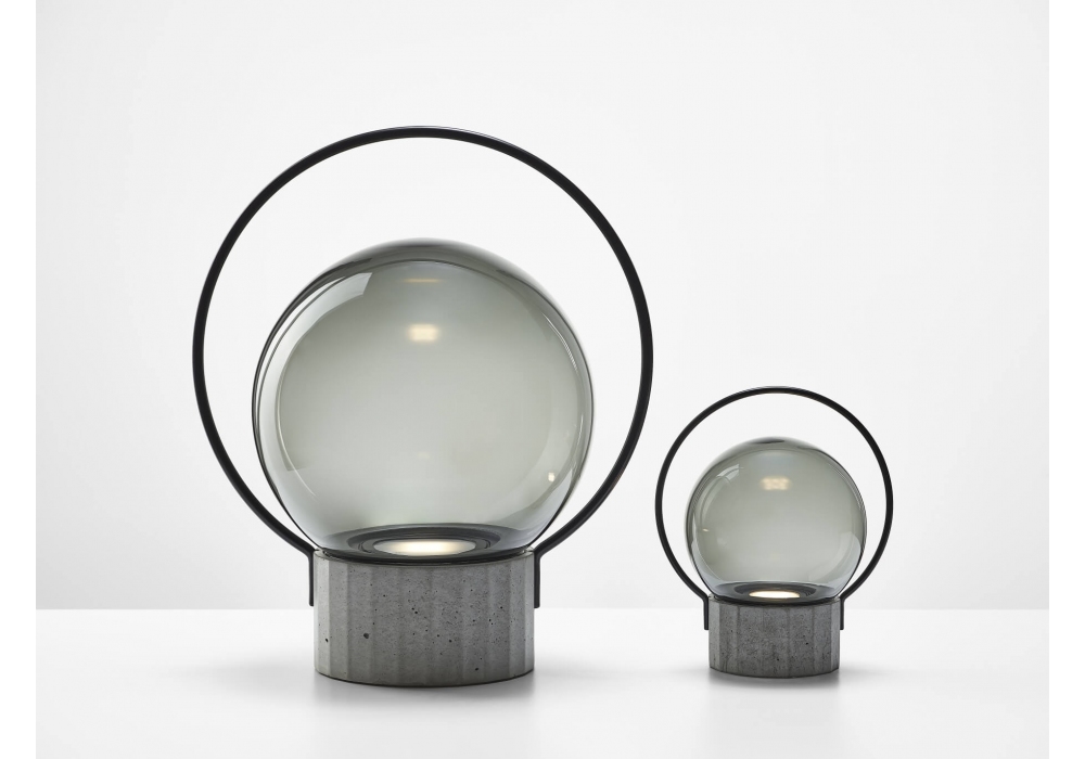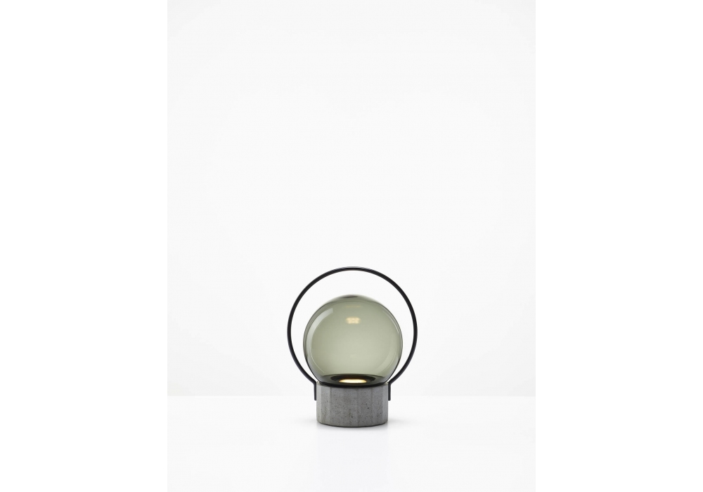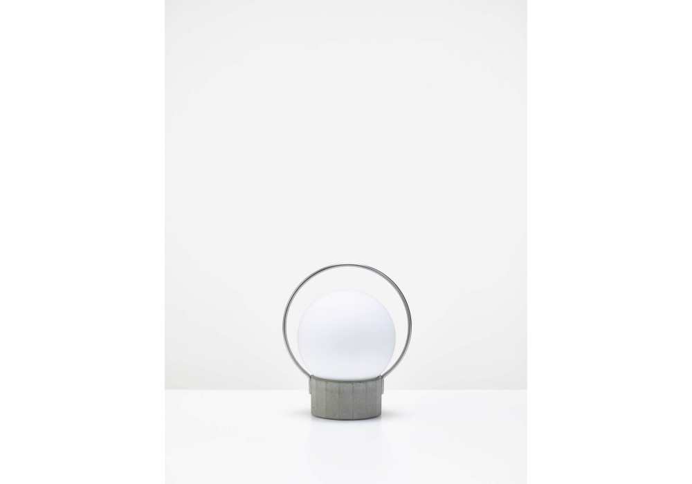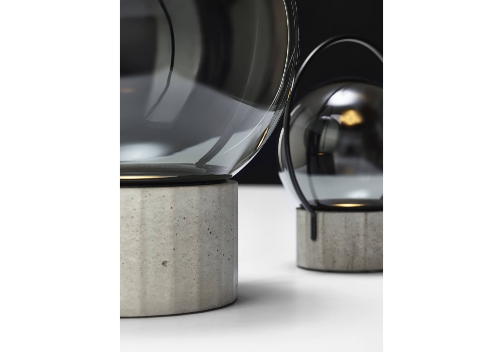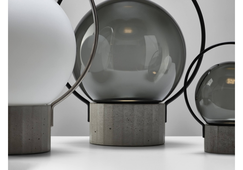 Sfera Portable, conçue par Lucie Koldova pour Brokis, est une lampe de table nomade dotée d'une structure métallique noir mat ou en acier inoxydable et d'une base polygonale en béton. Le diffuseur est sphérique en verre soufflé, avec une surface extérieure brillante ou gravée à l'acide pour une finition blanc opale triplex. La source lumineuse est une LED à intensité variable, alimentée par un câble d'alimentation USB 2/USB-C noir. L'intensité lumineuse est réglable d'un simple toucher sur 3 niveaux.