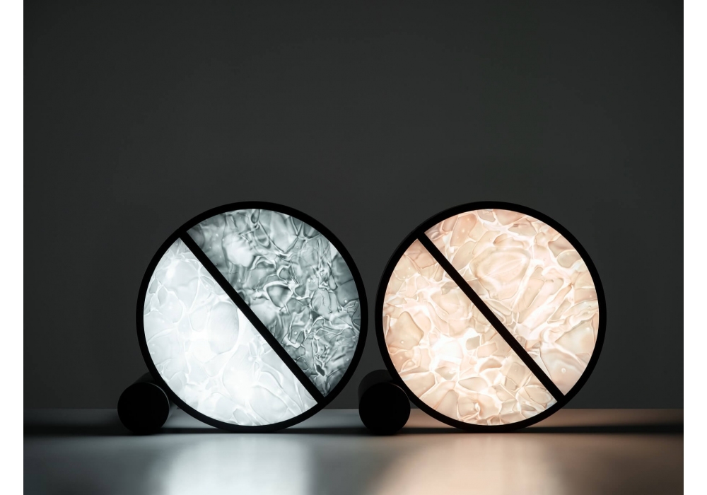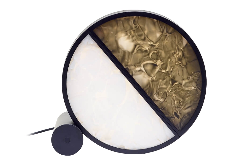 Geometric conçue par Boris Klimek & Lenka Damova pour Brokis est une lampe de table avec structure circulaire en métal thermolaqué noir mat. Le diffuseur est en verre et il est possible de choisir la 1/2 partie supérieure dans une finition et la 1/2 partie inférieure dans une autre finition distincte. Le verre est structuré par divers petits fragments ancrés les uns aux autres par fusion. La source lumineuse est une LED dimmable avec un câble d'alimentation en fibre textile noire.