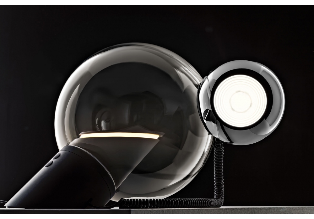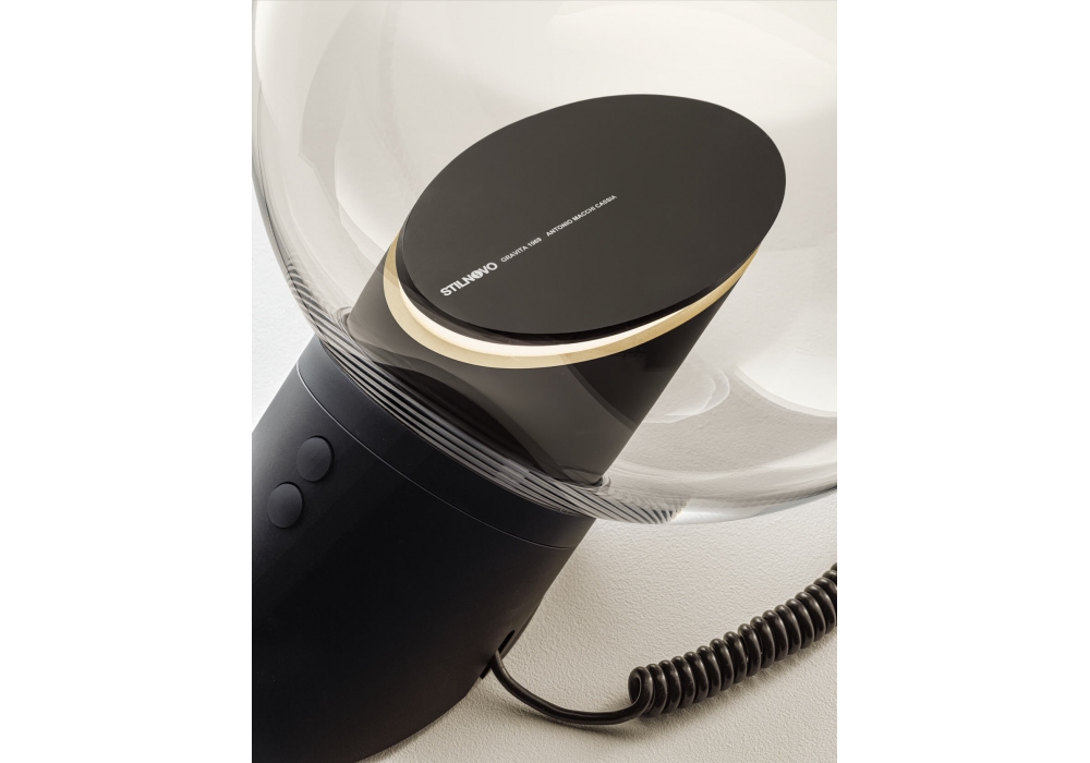 Gravità conçue par Antonio Macchi Cassia pour Stilnovo est une lampe de table structurée par la combinaison de l'aluminium et du verre soufflé. Le diffuseur est en verre soufflé de forme sphérique ancré à une sphère réglable en aluminium chromé. La base est en aluminium extrudé de couleur noire anodisée. Les deux sources lumineuses sont des LED dimmables à commutation indépendante.