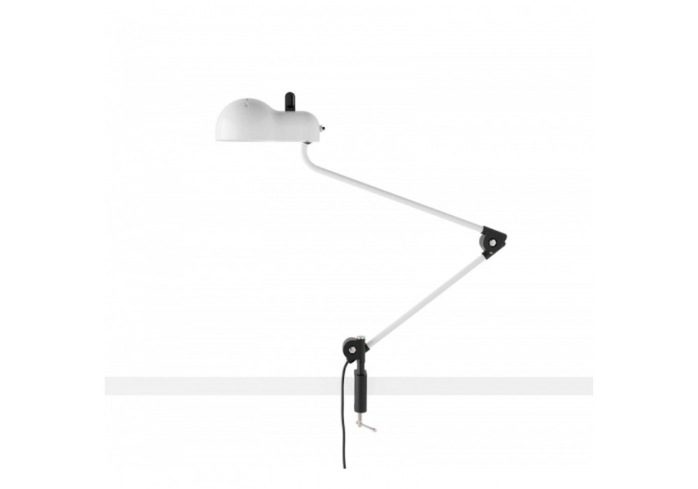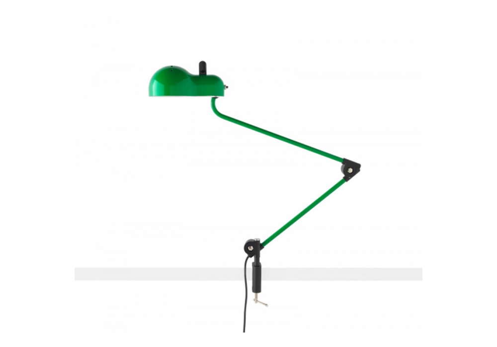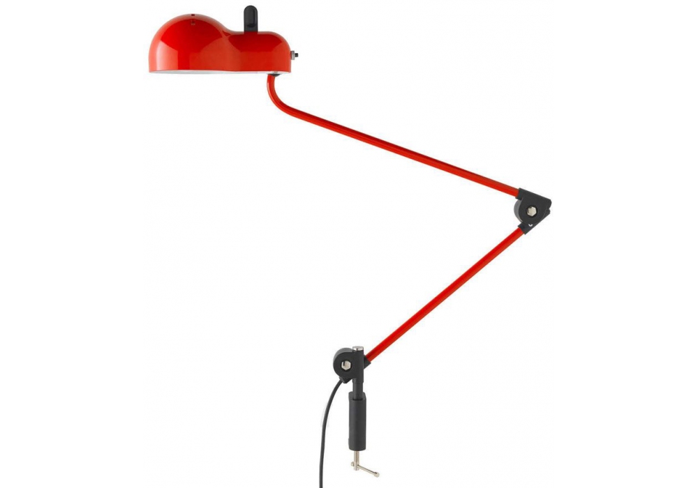 Topo Clamp conçue par Joe Colombo pour Stilnovo est une lampe de table structurée par la combinaison de métal, polyéthylène et matériau d'isolation thermique. la pince est en aluminium peint en noir, la tige et les bras mobiles sont en métal avec des articulations en matière plastique. Le diffuseur est en métal orientable de 50° horizontalement et de 25° verticalement. Topo Clamp est disponible dans les finitions : blanc, noir, rouge emblématique, vert menthe et chrome.