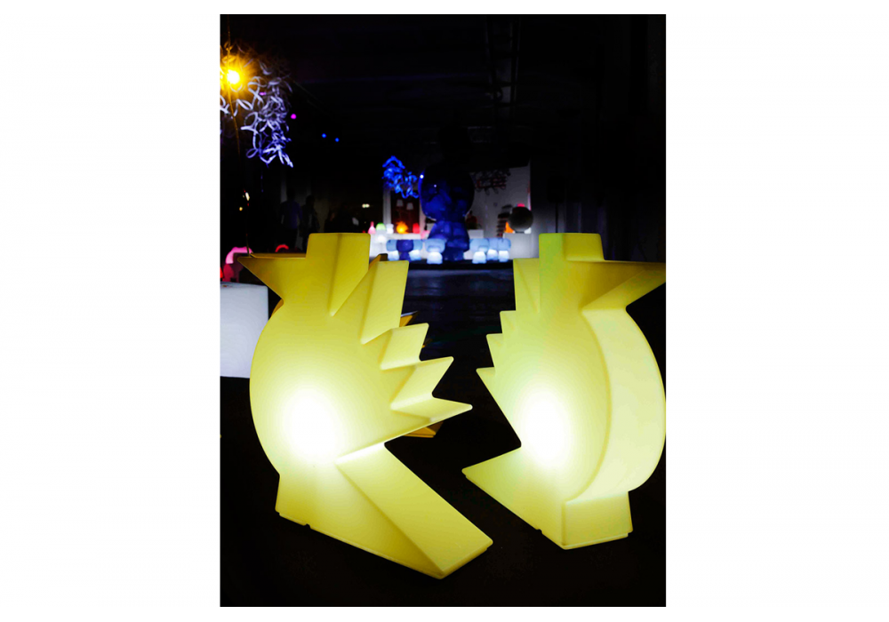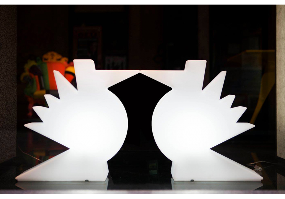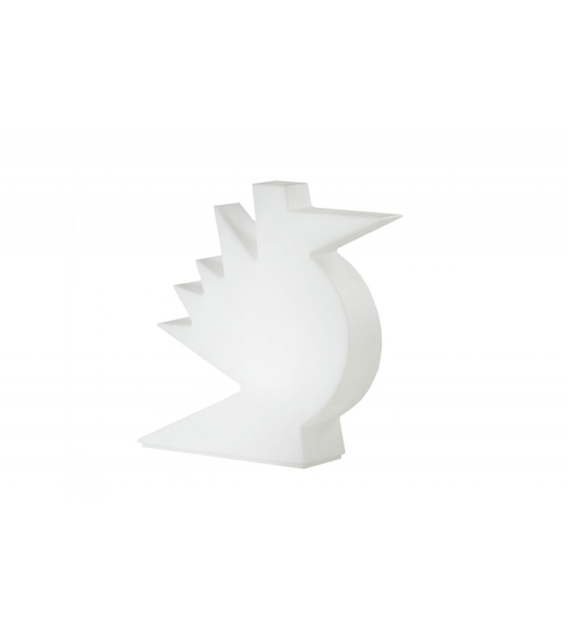 Here conçue par Alessandro Mendini pour Slide est une petite lampe de table à fort impact visuel, avec une forme abstraite et géométrique. Disponible dans la version brillante et dans la version laquée en différentes finitions