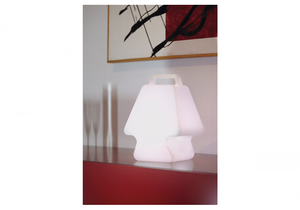Pret-à-Porter conçu par Antonio Norero pour Slide est une lampe de table au design moderne avec une petite poignée qui peut être facilement déplacée et accrochée