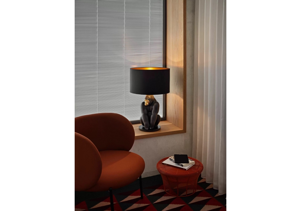 Gorilla sculptée par Marco Antonio Noguerón et conçue par Robert Schnyder pour Lladró est une lampe de table à base circulaire en porcelaine noire mate. Le corps de la lampe est en porcelaine noire avec des détails dorés, tandis que l'abat-jour est en tissu noir avec un intérieur doré.