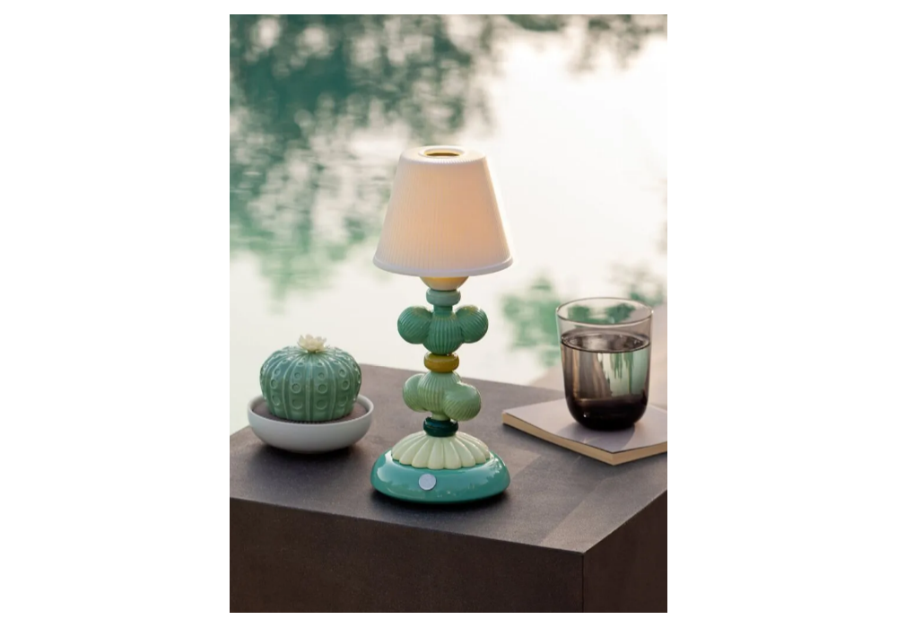 Cactus Firefly conçue par Dept. Diseño y Decoración pour Lladró est une lampe de table portable. Le corps de la lampe est en porcelaine brillante et est disponible en différentes finitions, tandis que l'abat-jour est en porcelaine translucide. Firefly est équipé d'un port USB pour la recharge et d'un système de connectivité sans fil.