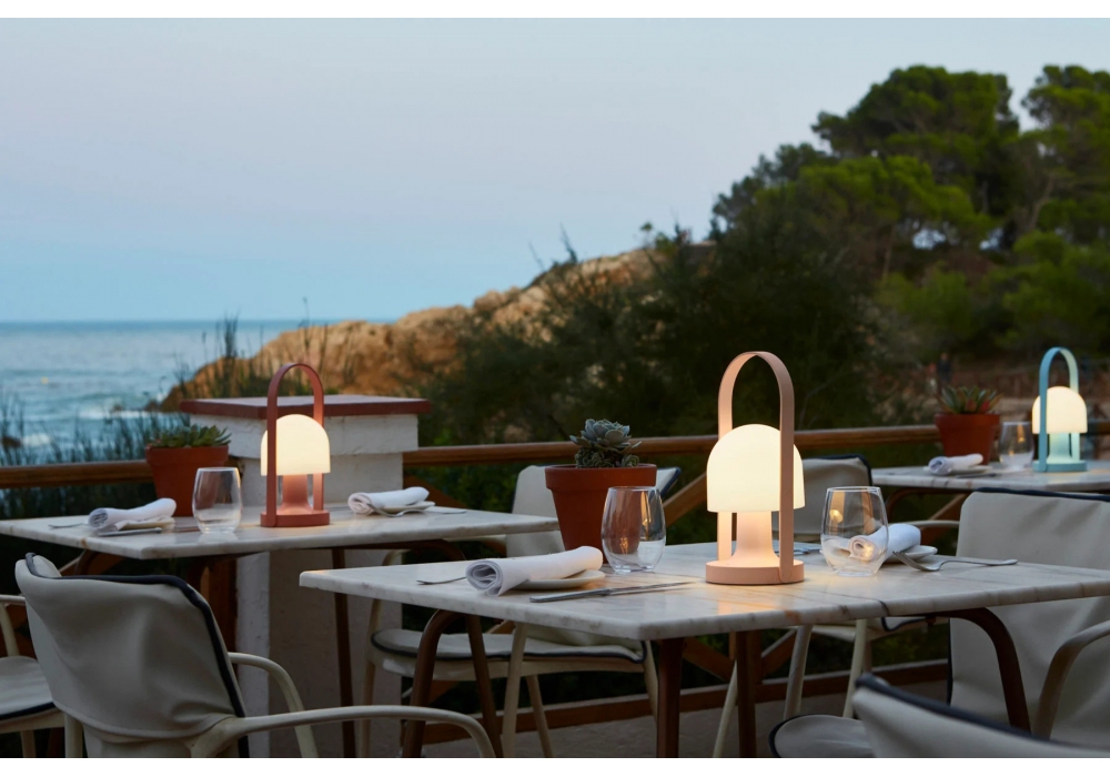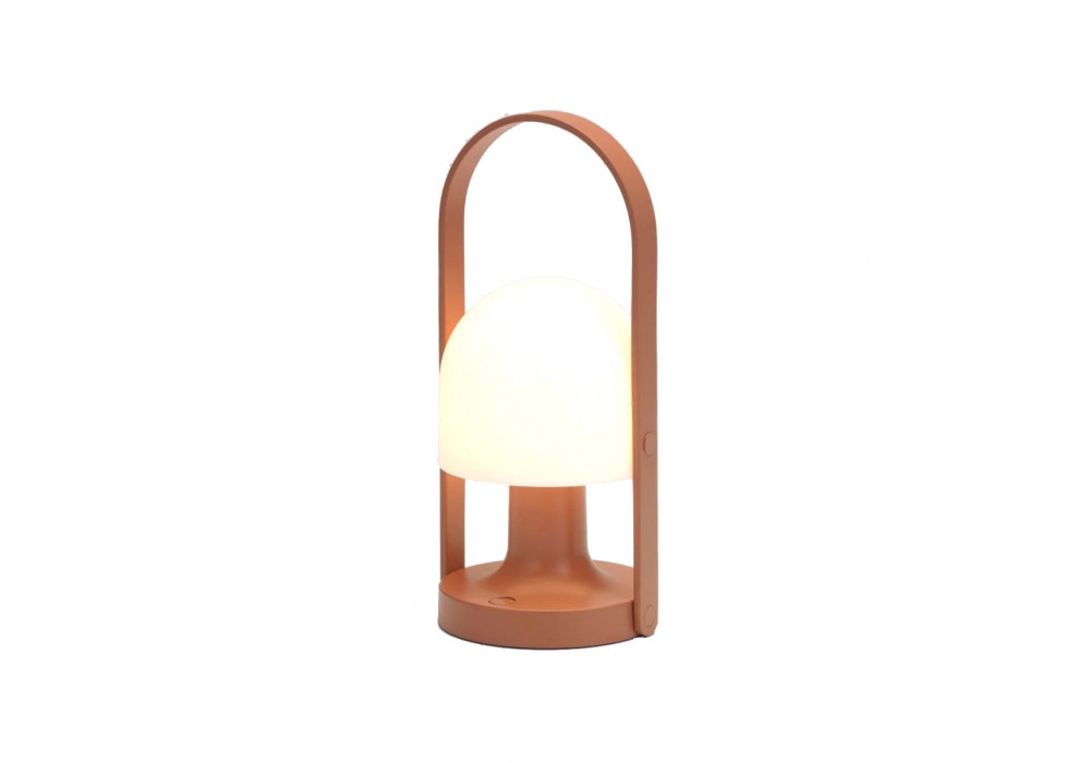 FollowMe conçue par Inma Bermúdez pour Marset est une lampe de table portable avec diffuseur en polycarbonate opale, corps en polycarbonate et poignée en contreplaqué.