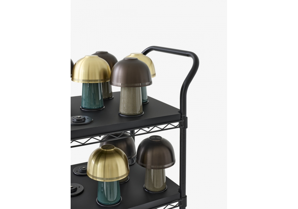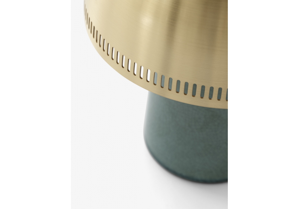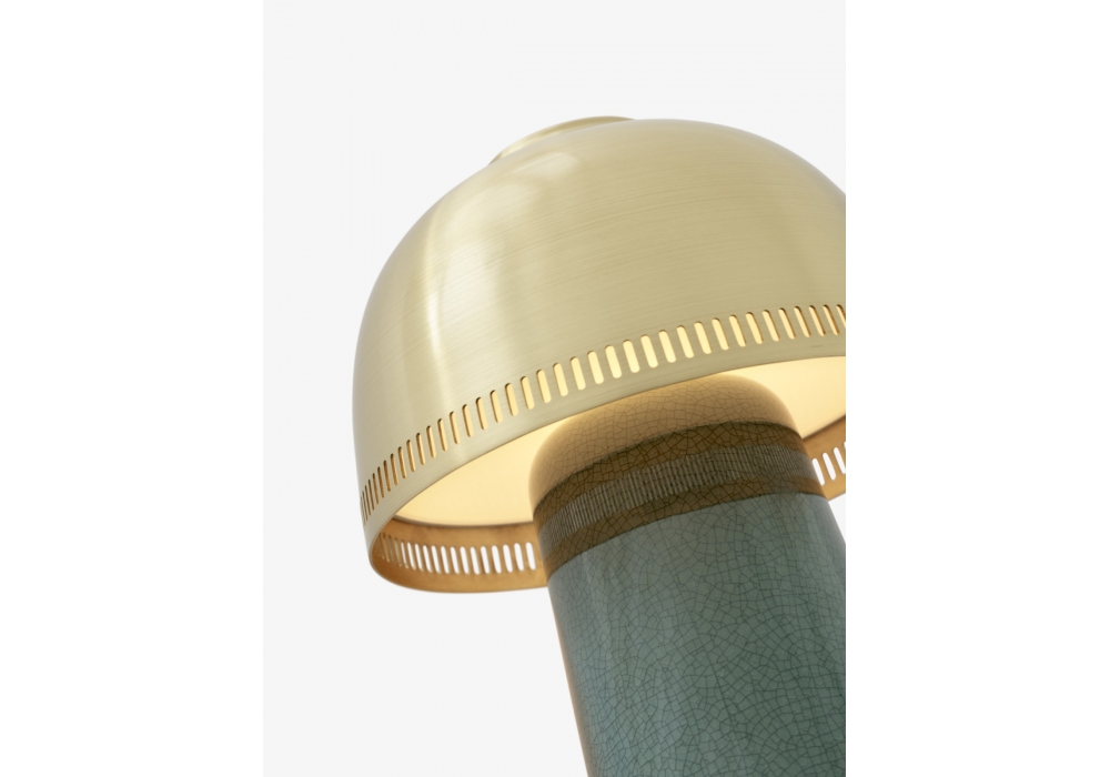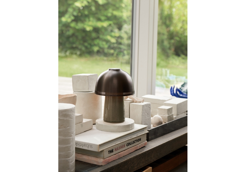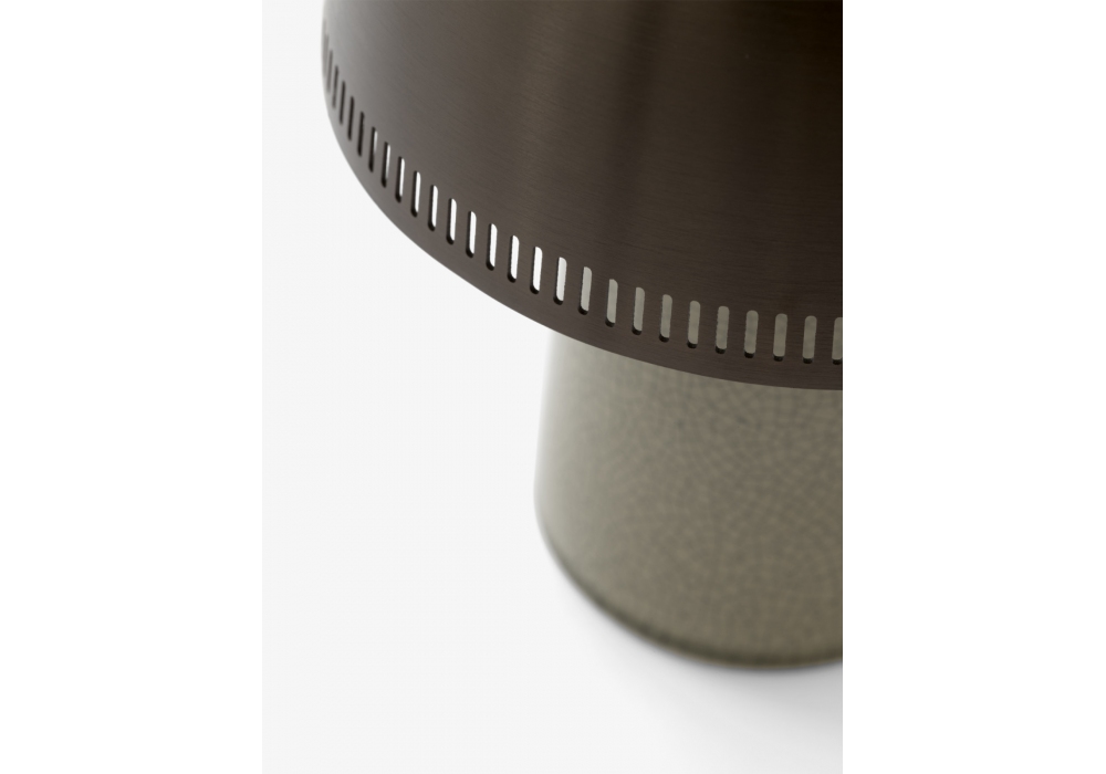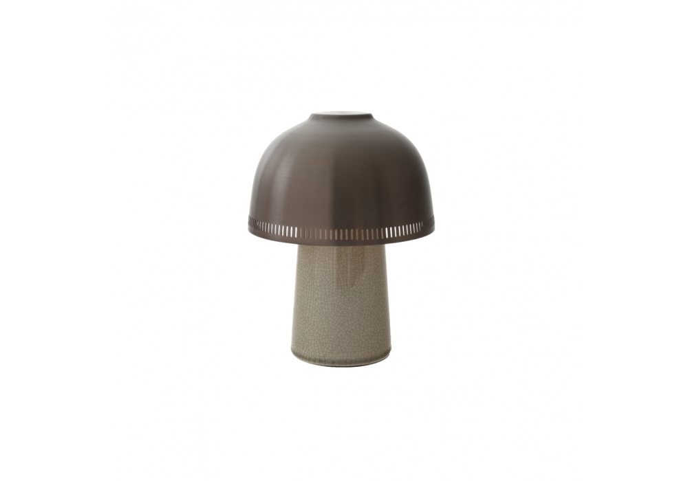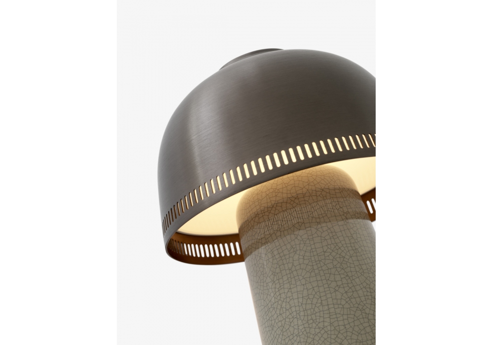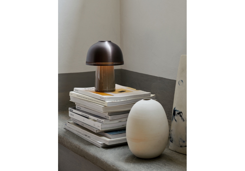 Raku conçue par Sebastian Herkner pour & Tradition est une lampe de table portable avec abat-jour en aluminium anodisé et laiton, base en céramique émaillée craquelée.
