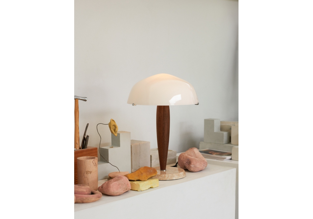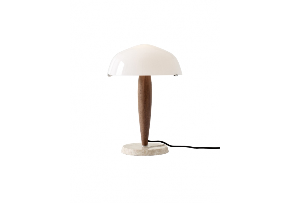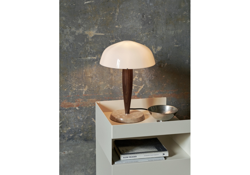 Herman conçue par Signe Hytte pour &Tradition est une lampe de table avec un abat-jour en verre opale, une tige en bois et une base en marbre.
