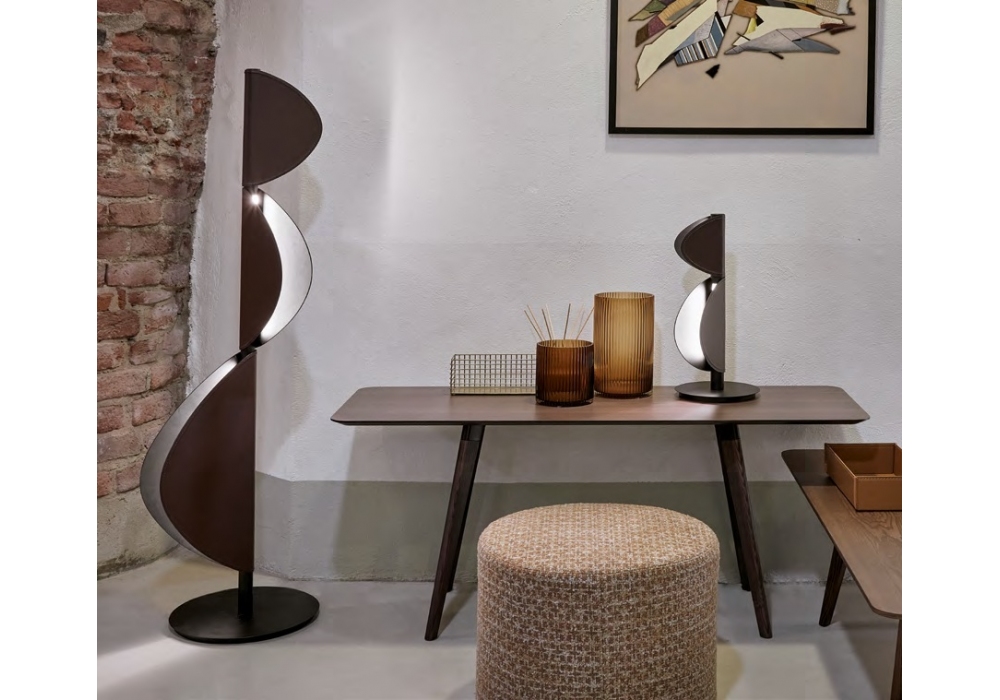 Spin conçue par Archirivolto pour Dema est une lampe de table réalisée avec une structure en métal peint et des abat-jour réglables en métal peint recouvert de cuir à l'extérieur.