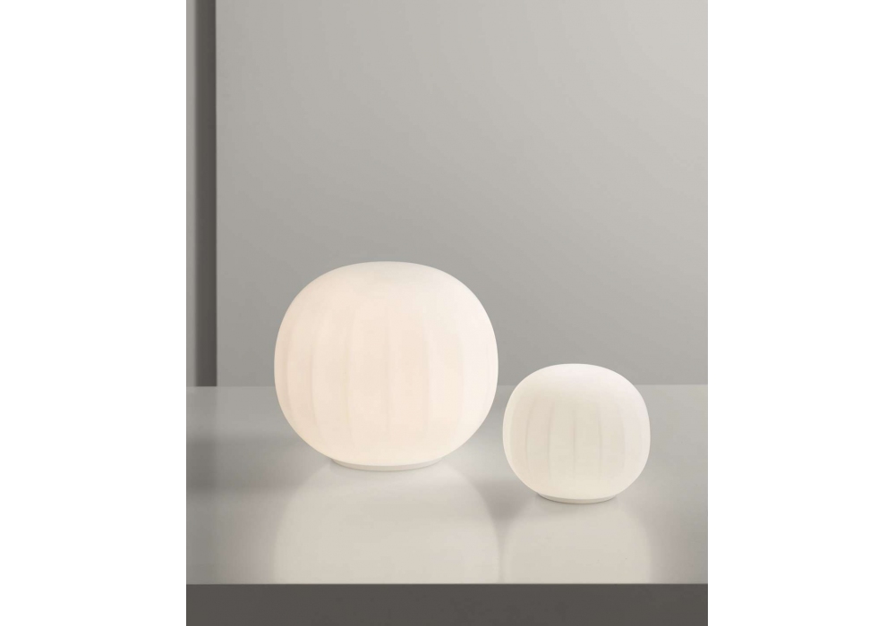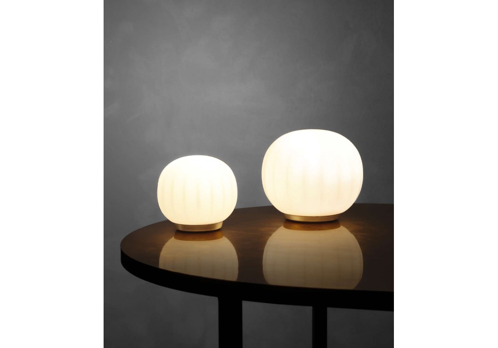 Lita conçue par David Dolcini pour Luceplan est une lampe de table sphérique avec structure en aluminium peint blanc mat ou laiton et diffuseur en verre soufflé blanc opale. Disponible en différentes dimensions.