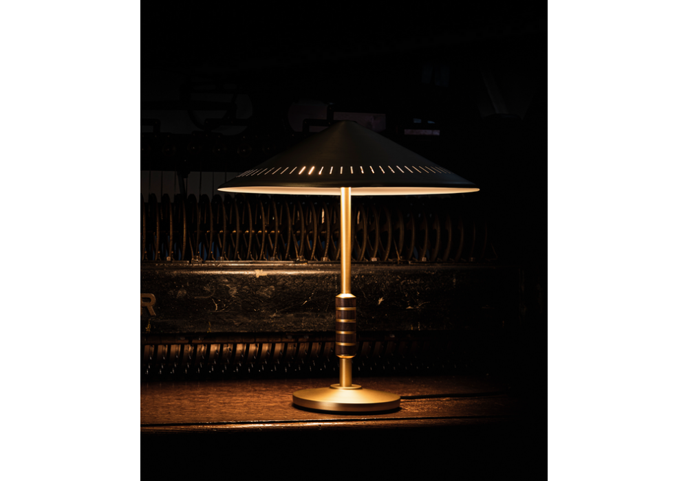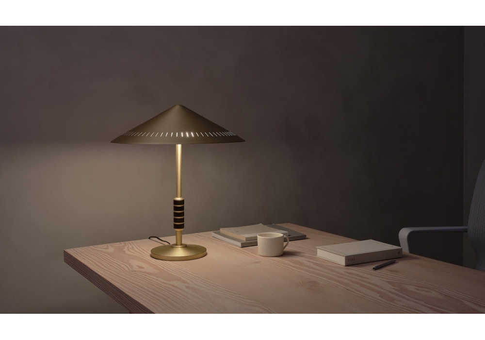 Governor conçue par Bent Karlby pour Lyfa est une lampe de table, l'abat-jour, la tige et la base sont tous en laiton mat, la poignée décorative est en noyer avec des incrustations en laiton.