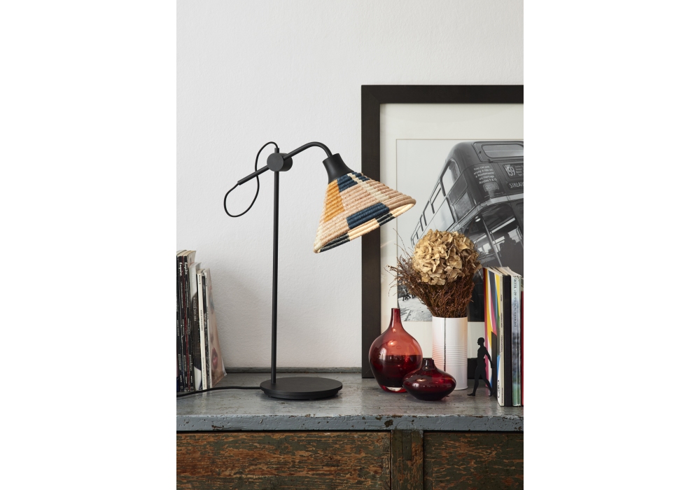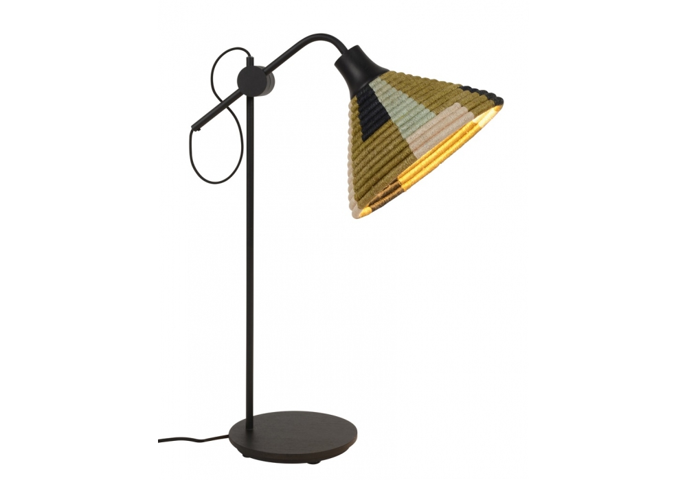 Parrot conçue par Jette Scheib pour Forestier est une lampe de table avec diffuseur en bois recouvert d'un cordon textile en velours et coton et base en métal noir. Disponible en différentes finitions.