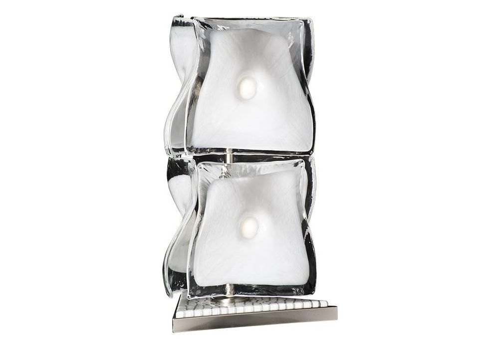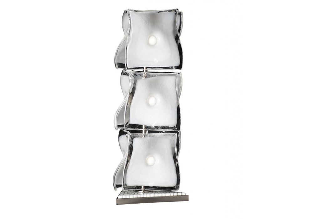 Veliero conçue par Tadao Ando pour Venini est une lampe de table avec structure en métal nickel brossé, diffuseur en verre soufflé couleur cristal/lattimo. La base est ornée de murrine. Disponible en 2 tailles. Édition limitée de 29 œuvres en chiffres arabes + 5 en chiffres romains.