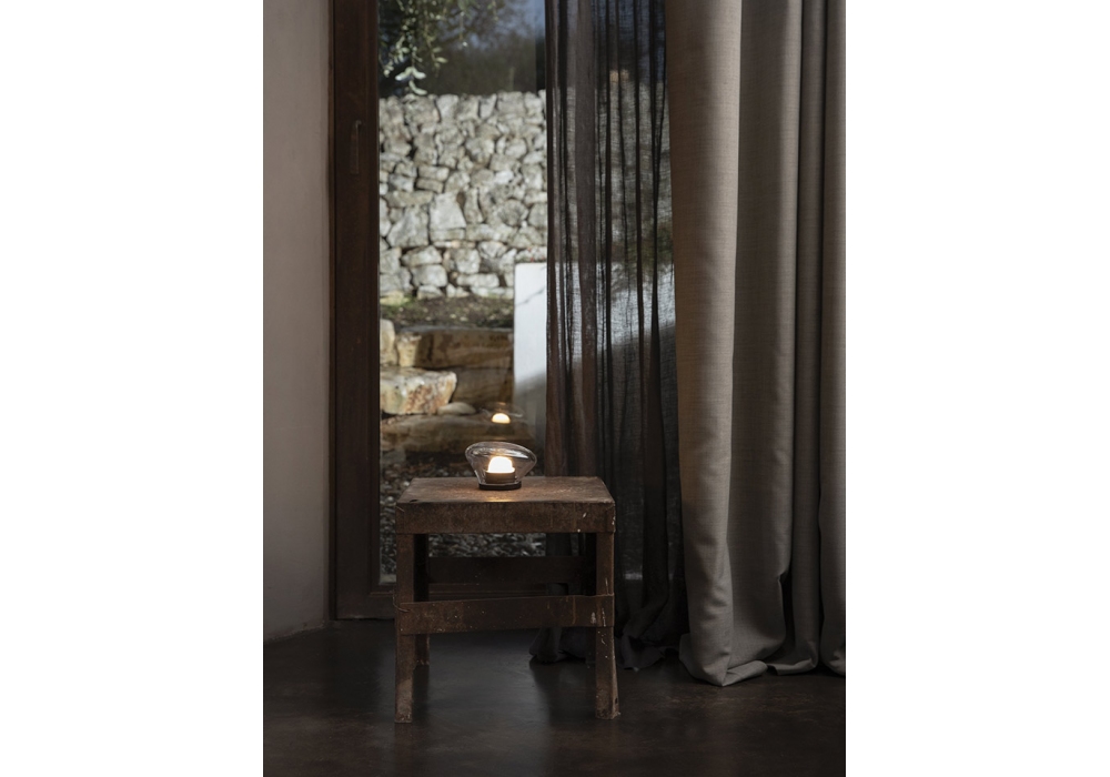Agua conçue par Matteo Ugolini & Edmondo Testaguzza pour Karman est une lampe de table à led avec structure en aluminium noir mat et diffuseur en verre transparent ou dépoli à l'acide. Usage interne.