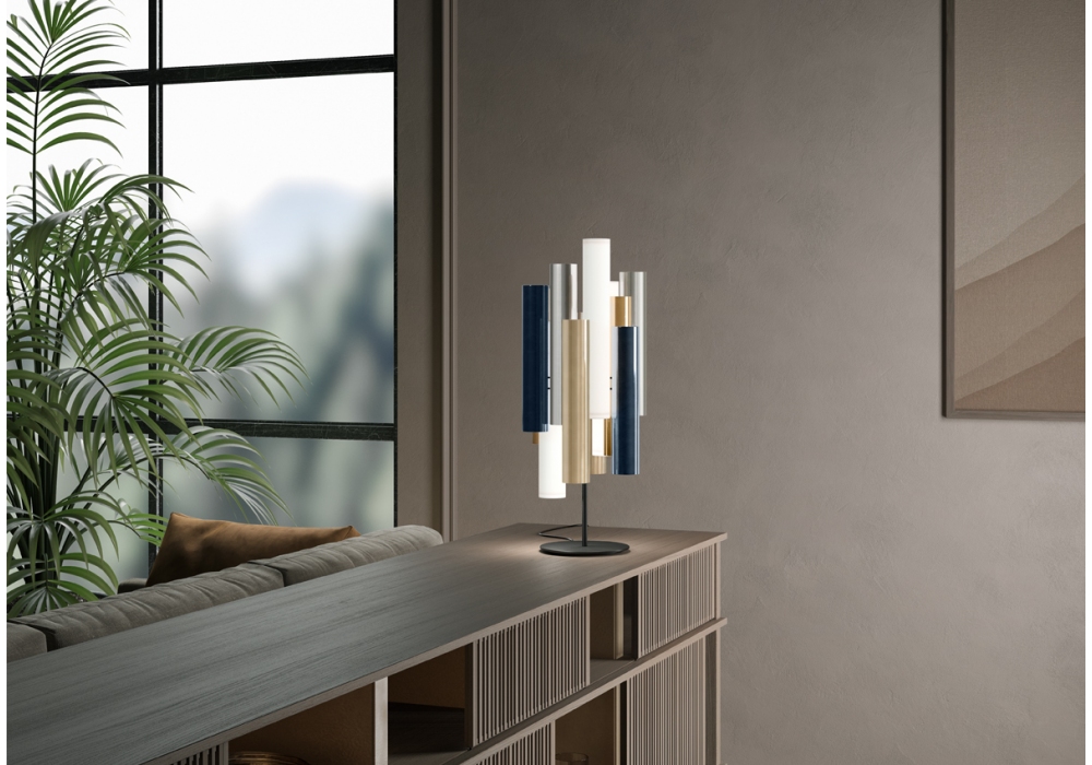 Toot conçue par Karim Rashid pour Kundalini est une lampe de table dimmable. Diffuseurs en plexiglas coloré ou satiné. Structure en métal peint.