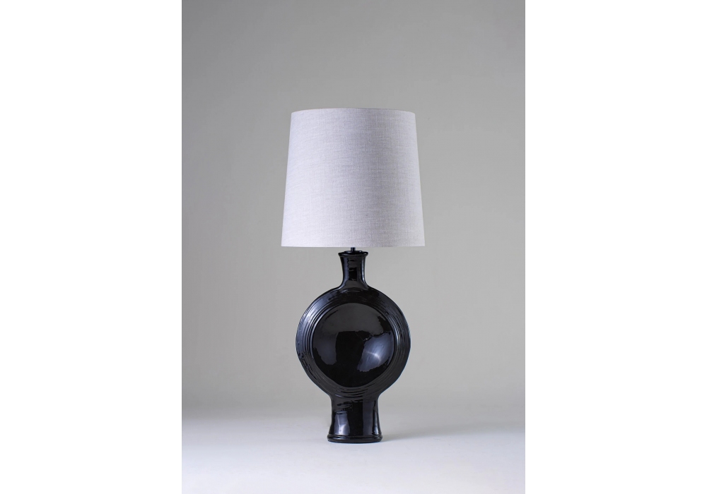 Conrad conçue par Dylan Bowen pour Porta Romana est une lampe de table structurée en céramique émaillée et métal. L'abat-jour est en tissu et abrite une source lumineuse de type LED avec une douille E27. Conrad est disponible en différentes finitions d'abat-jour et de structure.