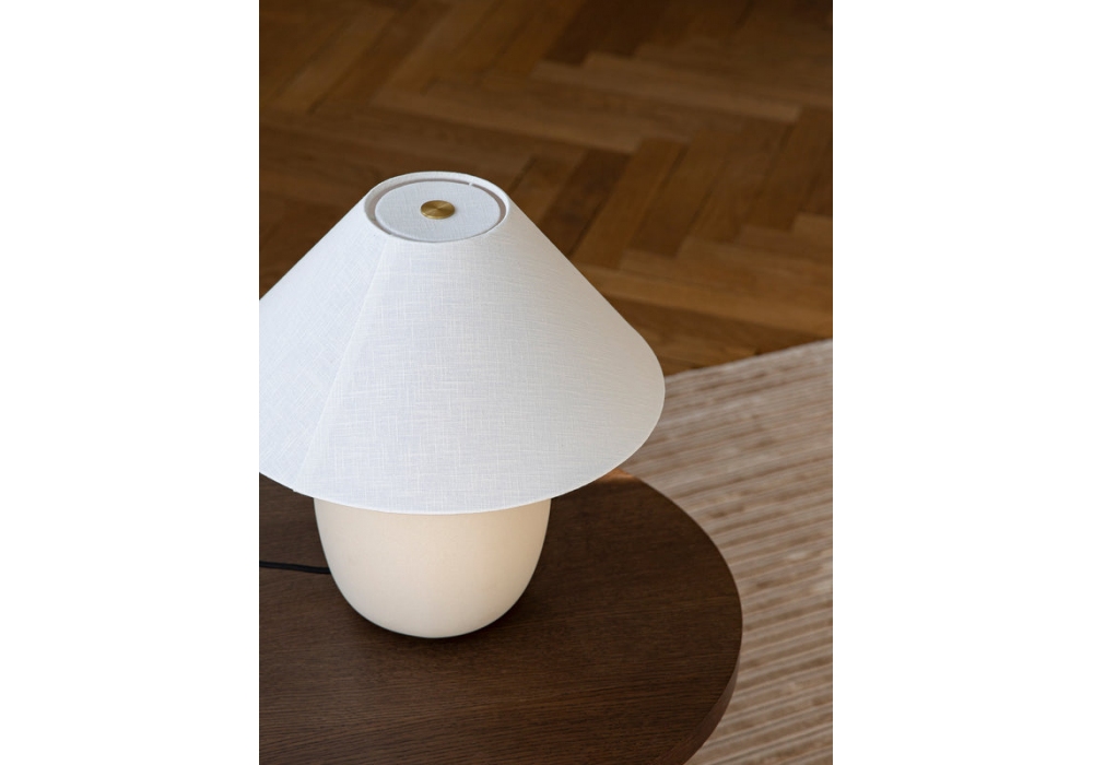 Torso 37 conçue par Krøyer-Sætter-Lassen pour Audo Copenhagen est une lampe de table avec base en céramique blanche et abat-jour en lin finition sable.