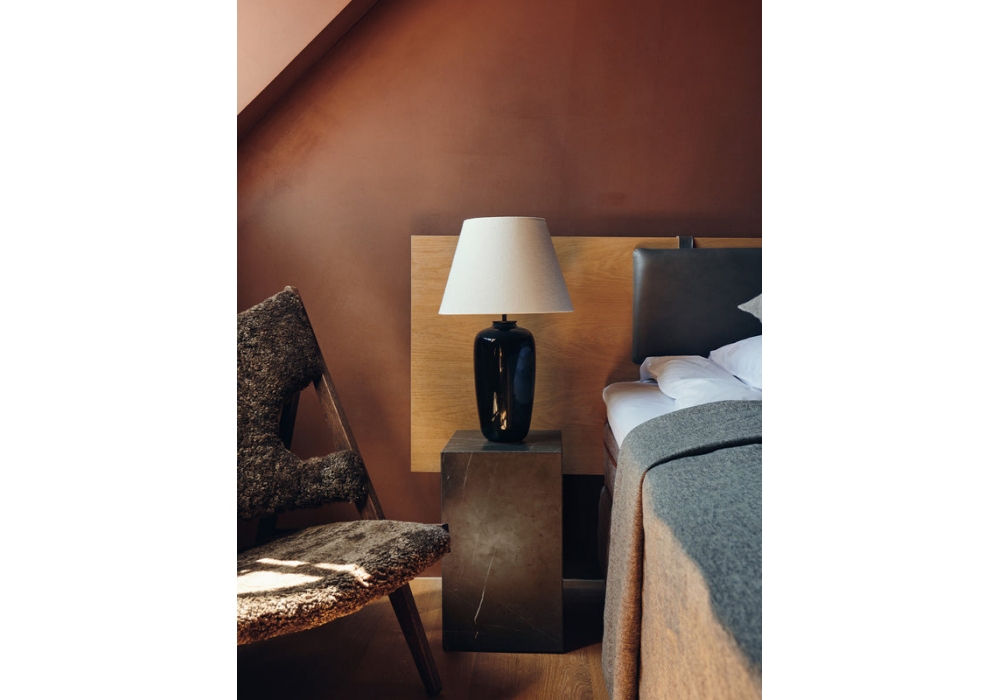 Torso 57 conçue par Krøyer-Sætter-Lassen pour Audo Copenhagen est une lampe de table avec base en céramique noire, abat-jour en lin finition blanche.
