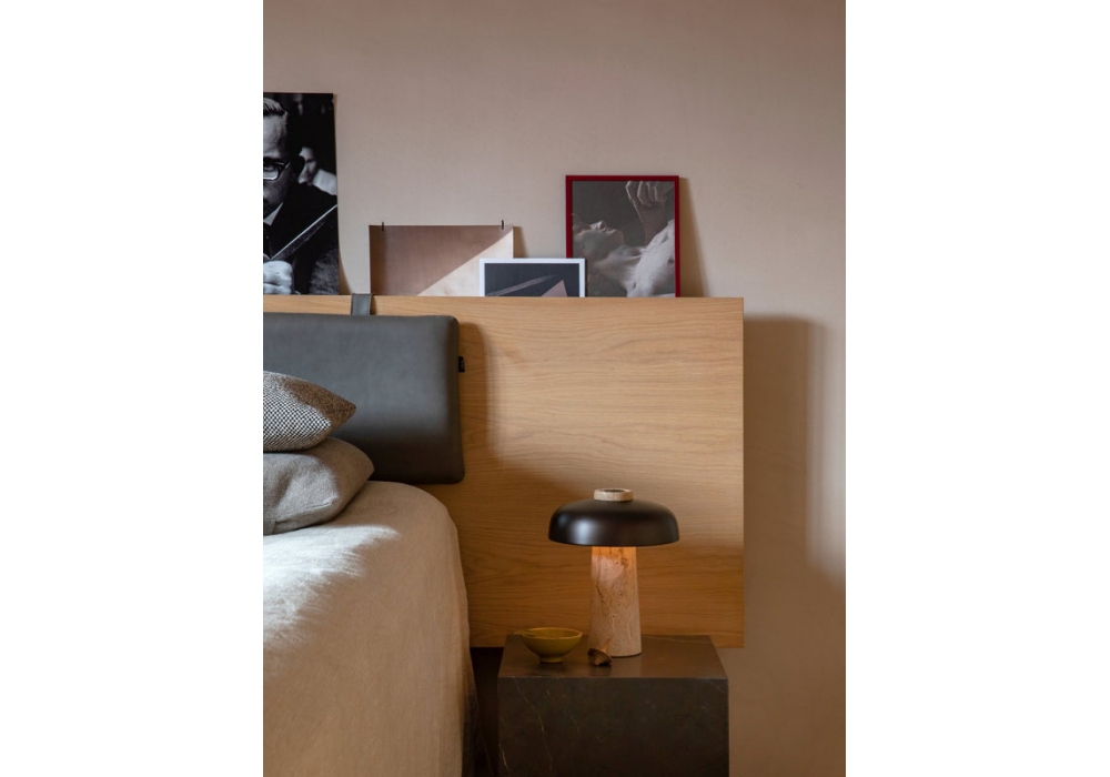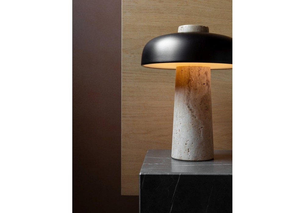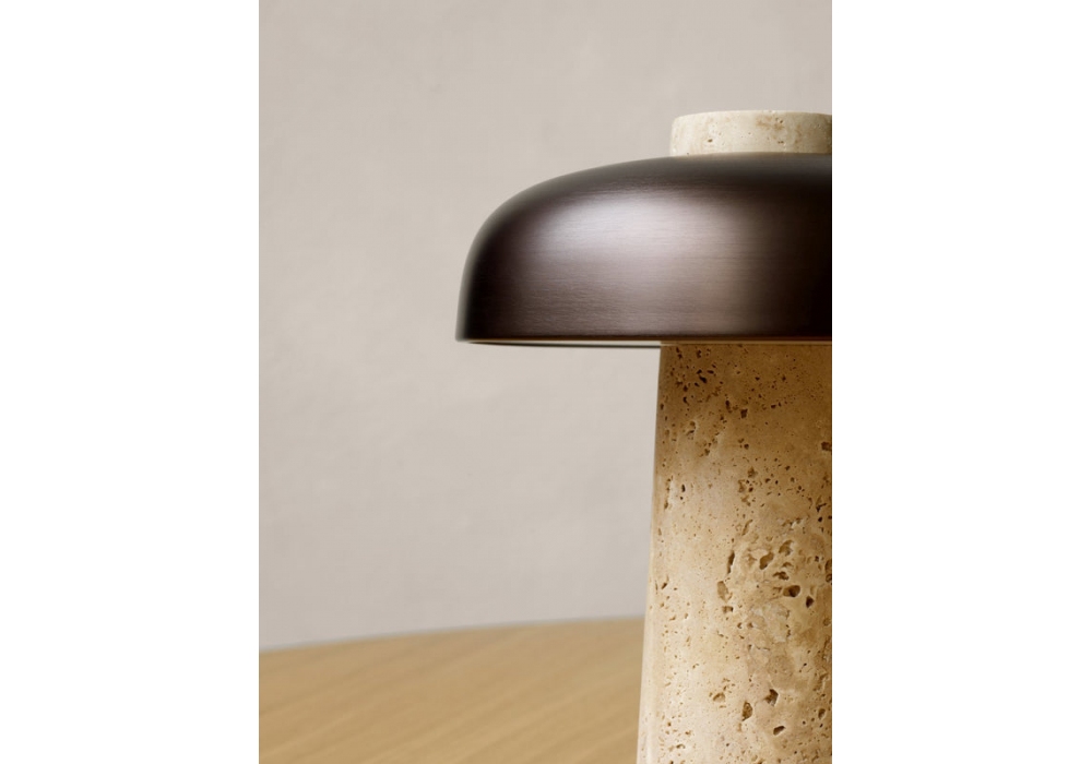 Reverse conçue par Aleksandar Lazic pour Audo Copenhagen est une lampe de table avec base en travertin et diffuseur en aluminium finition laiton bronzé.