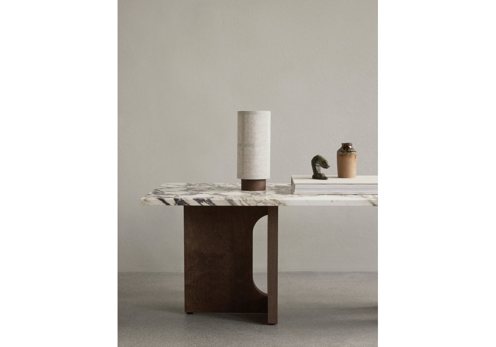 Hashira Portable conçue par Norm Architects pour Audo Copenhagen est une lampe de table portable en acier et abat-jour en lin. Disponible en différentes finitions.