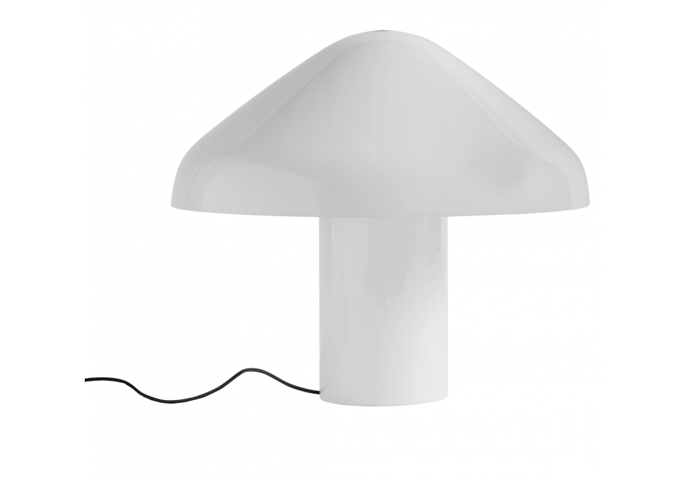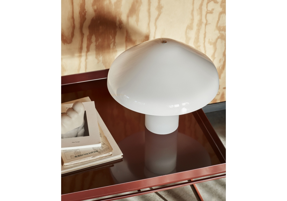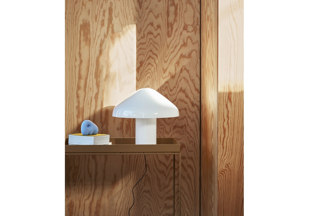 Pao Glass conçue par Naoto Fukasawa pour Hay est une lampe de table avec abat-jour en verre opalescent soufflé bouche. Câble en tissu tressé avec isolation en silicone.