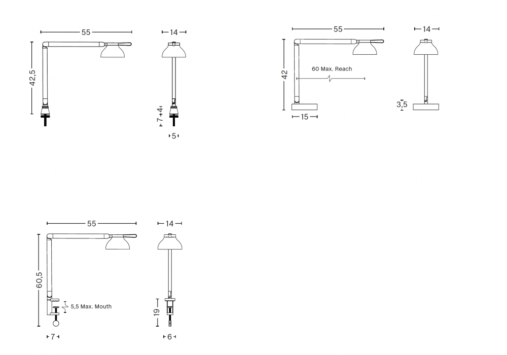 | Longueur de bras | 42 + 55 cm (avec socle) ; 60,5 + 55 cm (avec pince); 42,5 + 55 cm (avec insert de table). |