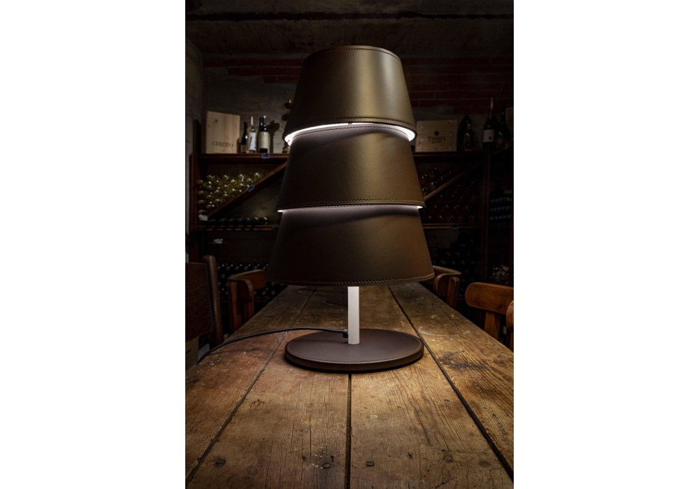 Tulip designed by Stefano Santilio for Enrico Pellizzoni is a table lamp in satin brass or white varnished. Circular base in metal, diffuser and rings covered in leather, available in different colours.