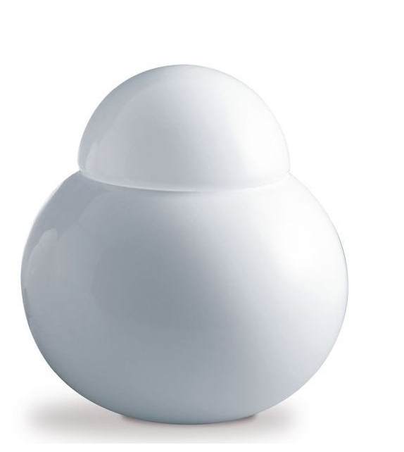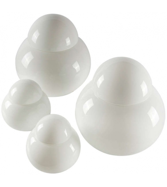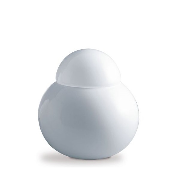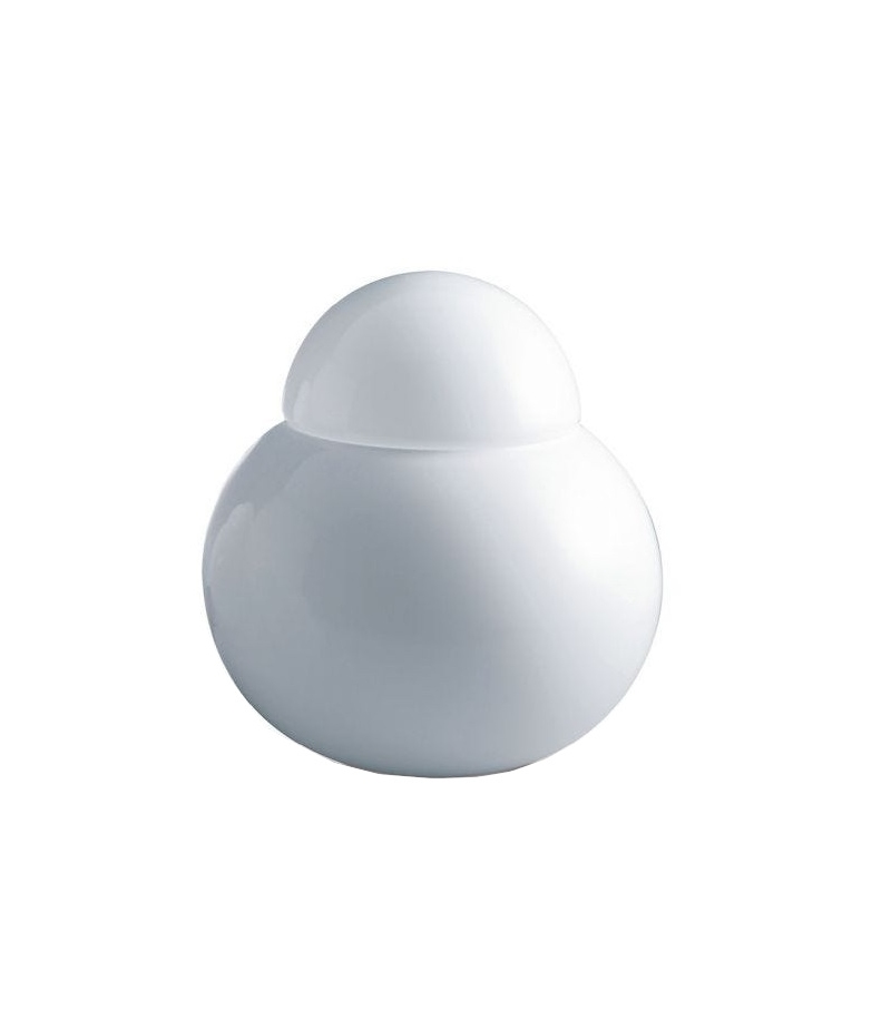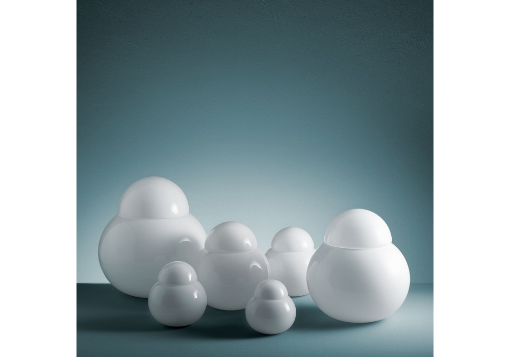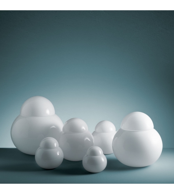Daruma conçue par Sergio Asti pour Fontana Arte est une lampe de table non dimmable à lumière diffuse avec diffuseurs en verre soufflé blanc brillant. Disponible en différentes dimensions.