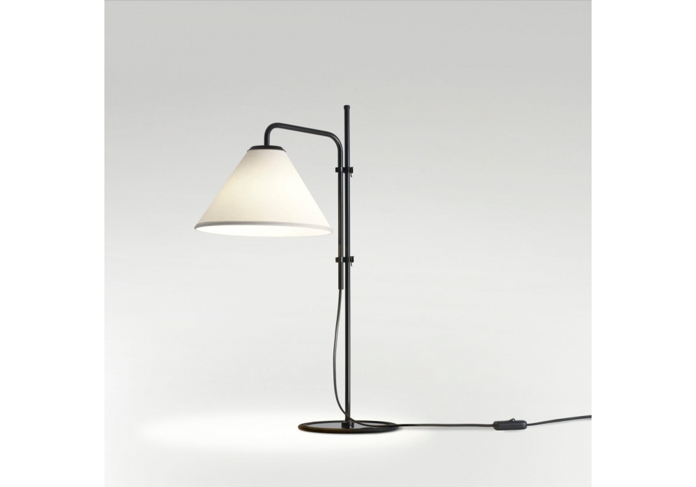 Funiculì S Fabric conçue par Lluís Porqueras pour Marset est une lampe de table avec base et tige en fer peint noir et abat-jour en polyester blanc ou sable.