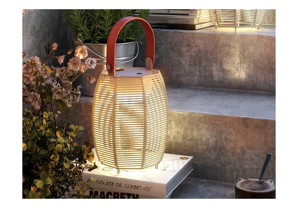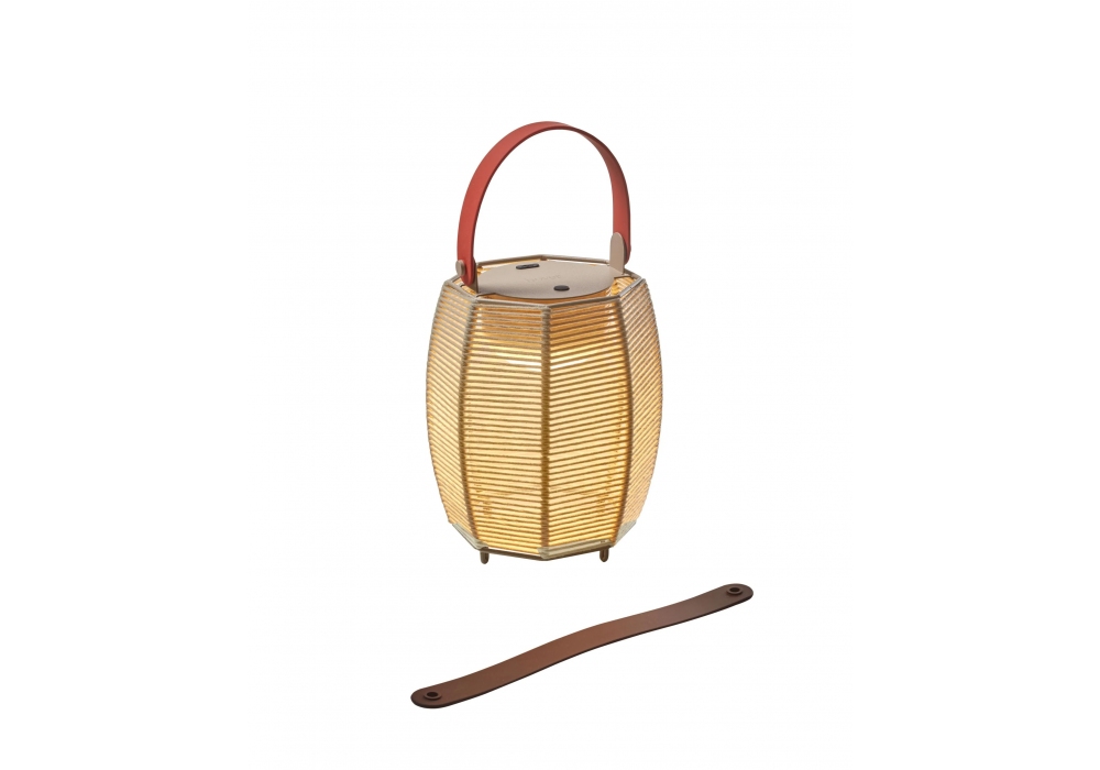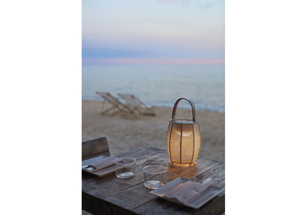 Tanit conçue par Gonzalo Milà pour Bover est une lampe de table rechargeable avec base et structure porteuse en fer et silicone. L'abat-jour est fait de corde de coton avec un diffuseur interne en polycarbonate blanc et protège une source de lumière LED avec interrupteur marche/arrêt.