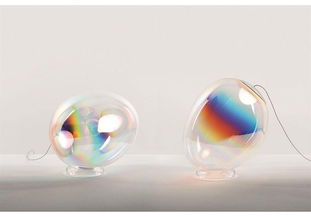 Stellar Nebula conçue par BIG - Bjarke Ingels Group pour Artemide est une lampe de table avec base circulaire en verre soufflé. Le diffuseur a une forme arrondie et est également en verre soufflé avec traitement PVD et le capuchon supérieur est en aluminium. La source lumineuse adoptée est la LED avec un système dimmable.