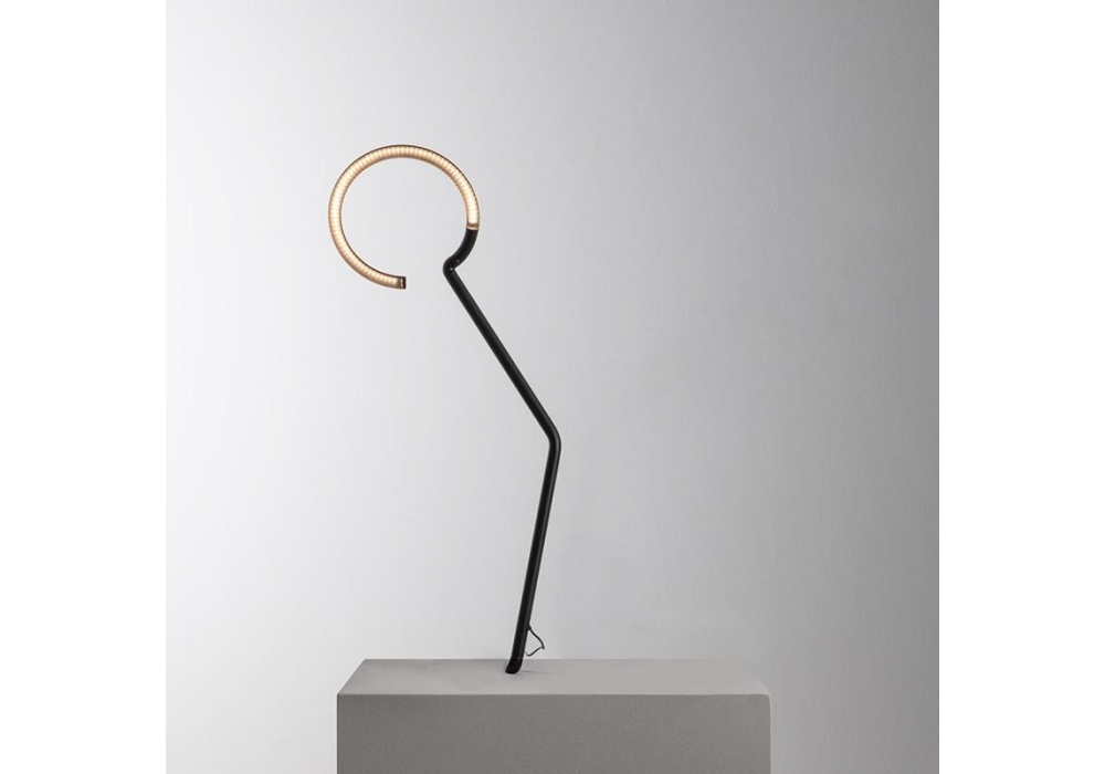 Vine Light conçue par BIG - Bjarke Ingels Group pour Artemide est une lampe de table avec base circulaire et tige verticale en zamak et aluminium peint en noir. Le diffuseur est en technopolymère et abrite une source lumineuse de type LED, dimmable en différentes nuances de lumière.