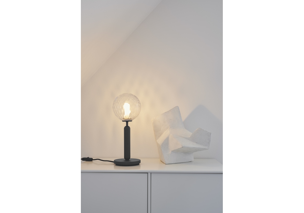 Miira conçue par Sofie Refer pour Nuura est une lampe de table avec structure en métal travaillé et diffuseur en verre opale soufflé bouche ou transparent avec motif en relief.