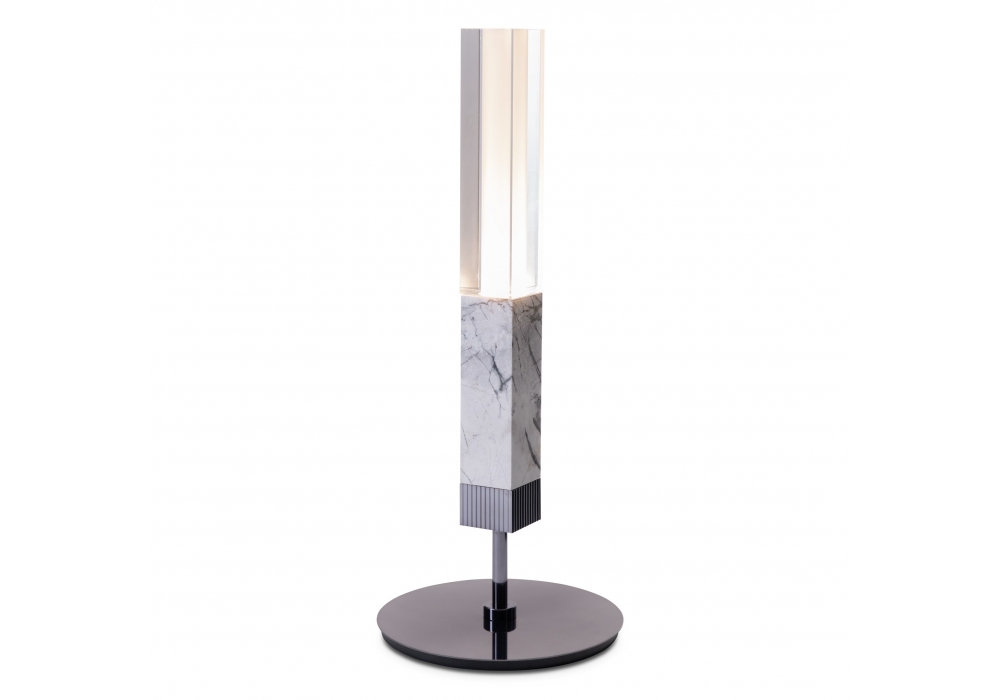 Milano conçue par Armando Bruno Alberto Torres pour Visionnaire est une lampe de table avec base circulaire et tige verticale en acier peint avec éléments verticaux en marbre. Le diffuseur est en polycarbonate transparent de forme quadrangulaire et adopte une source lumineuse LED. Milano est disponible en différentes finitions.