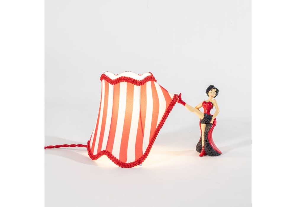 Circus Lucy conçue par Uto Balmoral pour Seletti est une lampe de table réalisée en résine colorée, métal et polyester. La source lumineuse adoptée est de type LED alimentée par un câble rouge.