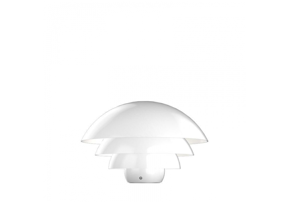 Visiere conçue par Sergio Asti pour Martinelli Luce est une lampe de table entièrement structurée par des colottes superposées en aluminium peintes en blanc brillant. Les sources lumineuses adoptées sont de type LED.