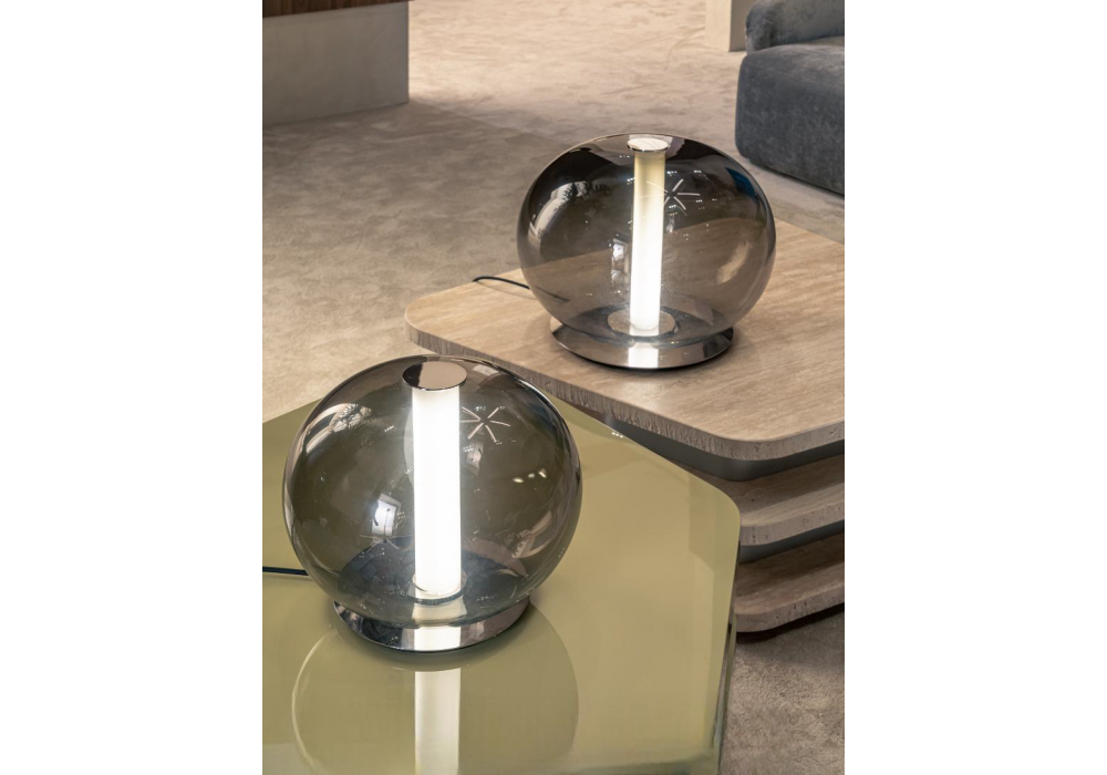 Vetra conçue par CSM pour Casamilano est une lampe de table avec diffuseur en verre Pyrex fumé. Base en fer chromé poli ou maillechort gravé à l'acide.