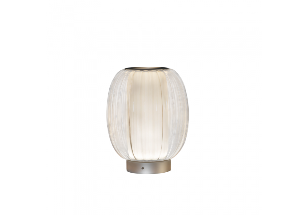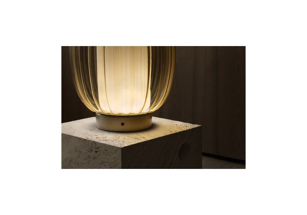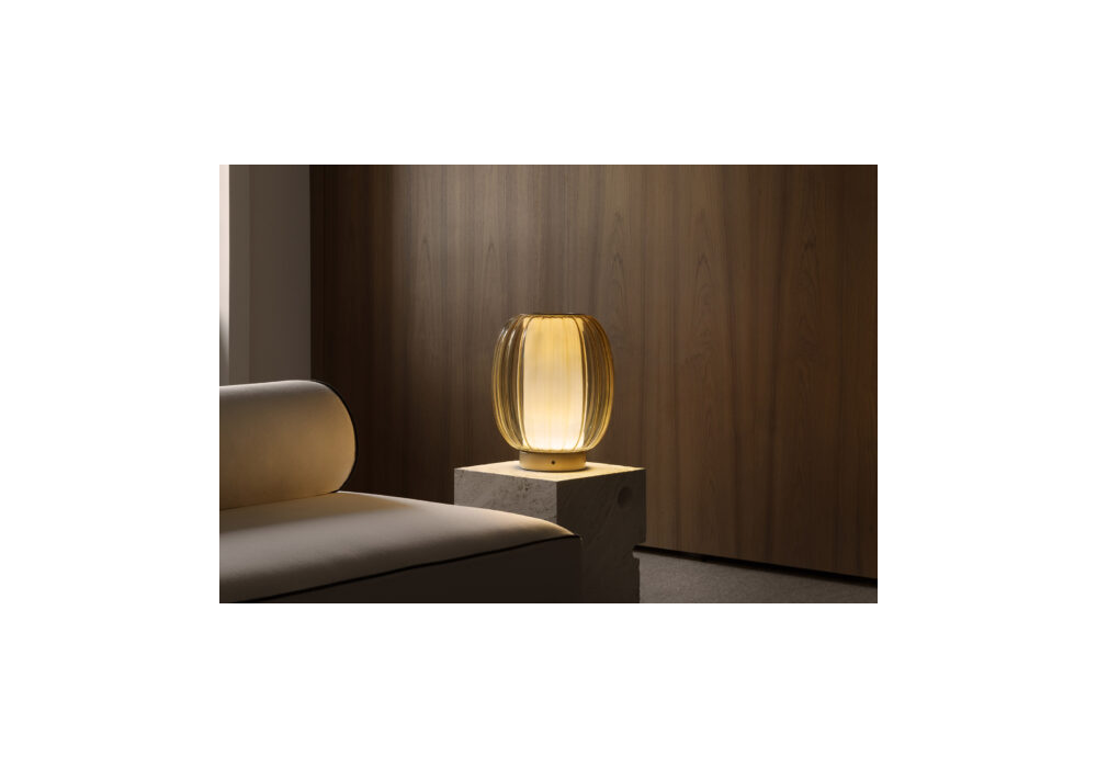 Alma conçue par Controvento pour Contardi est une lampe de table composée d'une structure couleur champagne, d'un diffuseur en verre transparent et d'un diffuseur interne en tissu plissé blanc.