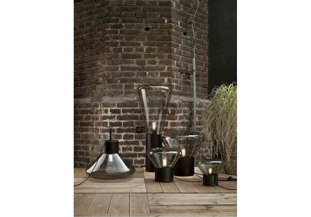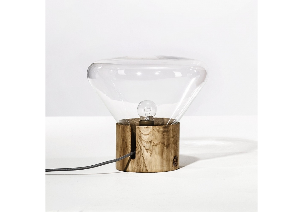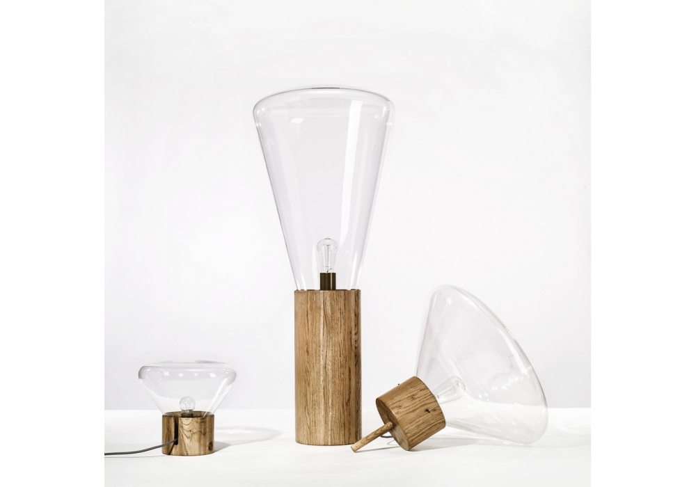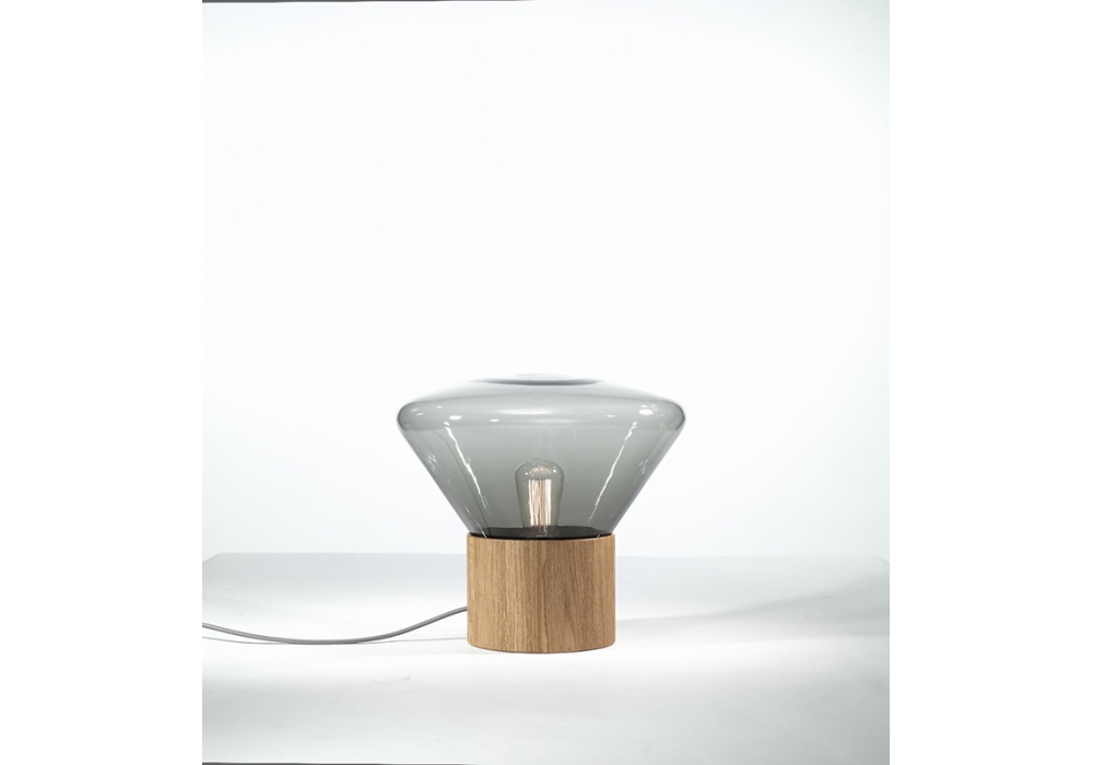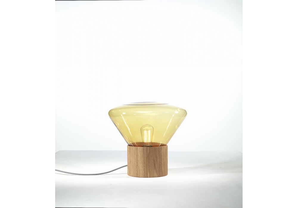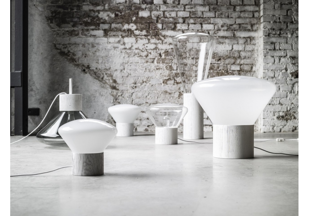 Muffins Mini Wood 06 conçue par Dan Yeffet et Lucie Koldová pour Brokis est une lampe de table/sol avec diffuseur en verre ombragé de différentes couleurs. La base est de forme cylindrique dans différentes finitions de bois traité ou naturel. La source lumineuse retenue est de type LED.