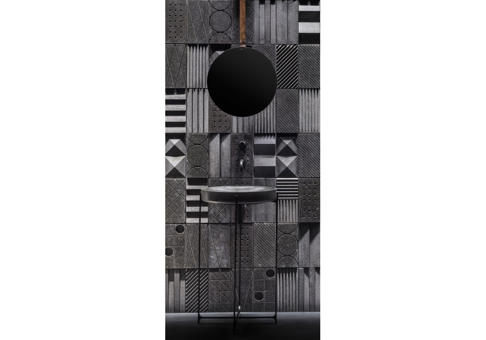 Etna conçu par Martinelli Venezia Studio pour Lithea est un lavabo à colonne en pierre, disponible en différentes finitions. Disponible avec ou sans miroir.